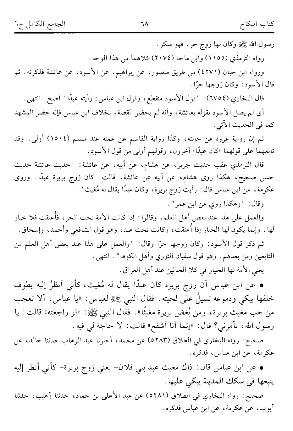 قال الترمذي عقب حديث جرير، عن هشام، عن أبيه، عن عائشة: "حديث عائشة حديث حسن صحيح، هكذا روى هشام، عن أبيه عن عائشة، قالت: كان زوج بريرة عبدًا. وروى عكرمة، عن ابن عباس قال: رأيت زوج بريرة، وكان عبدًا يقال له مُغيث".