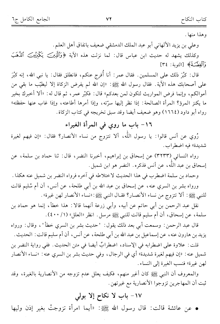 رُوي عن أنس قالوا: يا رسول اللَّه، ألا تتزوج من نساء الأنصار؟ فقال: "إن فيهم لغيرة شديدة" فيه اضطراب.