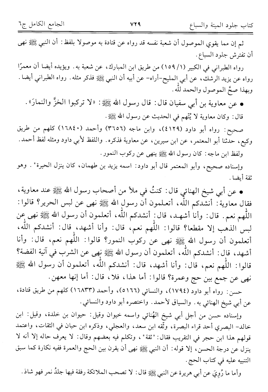 • عن أبي شيخ الهنائي قال: كنتُ في ملأ من أصحاب رسول الله - صلى الله عليه وسلم - عند معاوية، فقال معاوية: أنشدكم الله، أتعلمون أن رسول الله - صلى الله عليه وسلم - نهي عن لبس الحرير؟ قالوا: اللهم نعم. قال: وأنا أشهد، قال: أنشدكم الله، أتعلمون أن رسول الله - صلى الله عليه وسلم - نهى عن لبس الذهب إلا مقطعا؟ قالوا: اللهم نعم، قال: وأنا أشهد، قال: أنشدكم الله، أتعلمون أن رسول الله - صلى الله عليه وسلم - نهى عن ركوب النمور؟ قالوا: اللهم نعم، قال: وأنا أشهد، قال: أنشدكم الله، أتعلمون أن رسول الله - صلى الله عليه وسلم - نهى عن الشرب في آنية الفضة؟ قالوا: اللهم نعم، قال: وأنا أشهد، قال: أنشدكم الله، أتعلمون أن رسول الله - صلى الله عليه وسلم - نهى عن جمع بين حج وعمرة؟ قالوا: أما هذا، فلا، قال: أما إنها معهن.