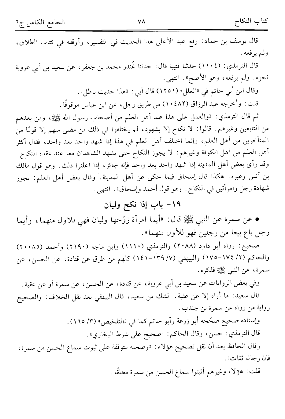 قلت: هؤلاء وغيرهم أثبتوا سماع الحسن من سمرة مطلقًا.