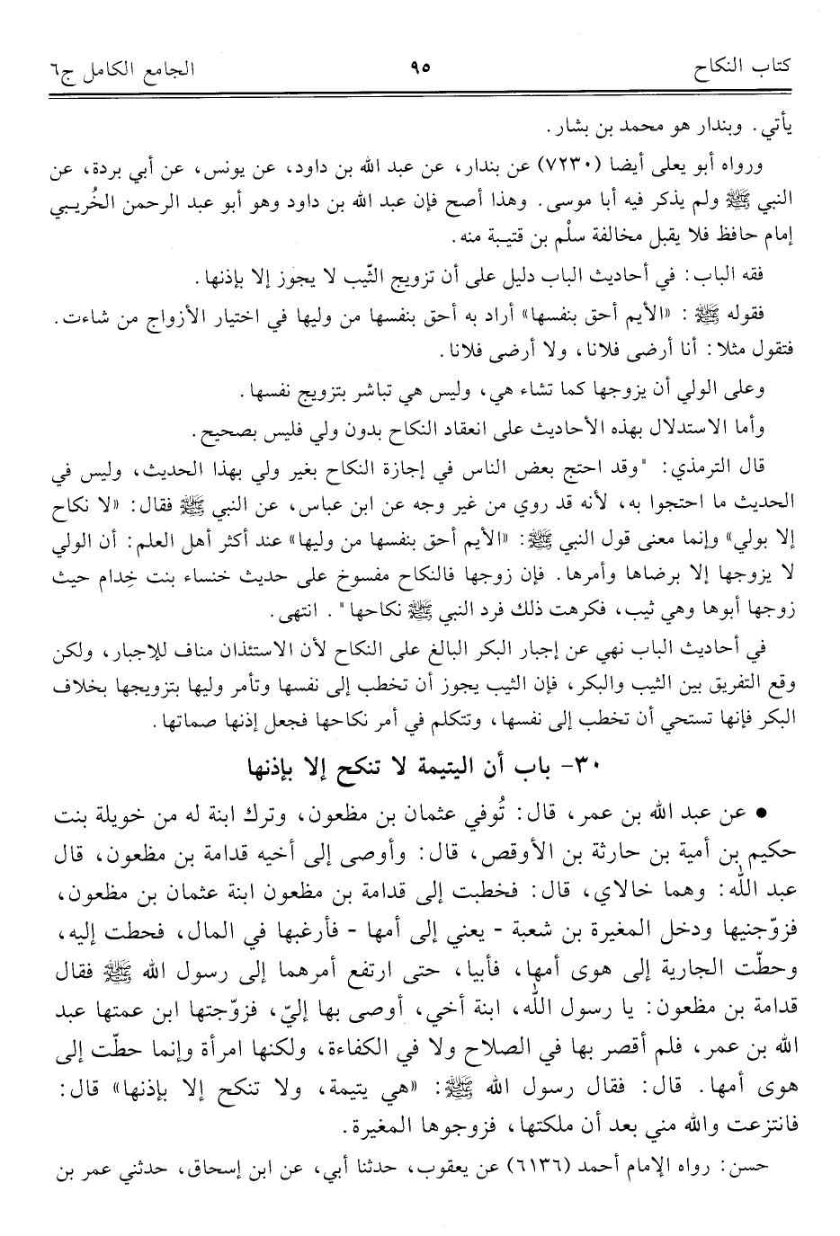 • عن عبد اللَّه بن عمر، قال: تُوفي عثمان بن مظعون، وترك ابنة له من خويلة بنت حكيم بن أمية بن حارثة بن الأوقص، قال: وأوصى إلى أخيه قدامة بن مظعون، قال عبد اللَّه: وهما خالاي، قال: فخطبت إلى قدامة بن مظعون ابنة عثمان بن مظعون، فزوجنيها ودخل المغيرة بن شعبة -يعني إلى أمها- فأرغبها في المال، فحطت إليه، وحطّت الجارية إلى هوى أمها، فأبيا، حتى ارتفع أمرهما إلى رسول اللَّه -صلى اللَّه عليه وسلم- فقال قدامة بن مظعون: يا رسول اللَّه، ابنة أخي، أوصى بها إليّ، فزوّجتها ابن عمتها عبد اللَّه بن عمر، فلم أقصر بها في الصلاح ولا في الكفاءة، ولكنها امرأة وإنما حطّت إلى هوى أمها. قال: فقال رسول اللَّه -صلى اللَّه عليه وسلم-: "هي يتيمة، ولا تنكح إلا بإذنها" قال: فانتزعت واللَّه مني بعد أن ملكتها، فزوجوها المغيرة.