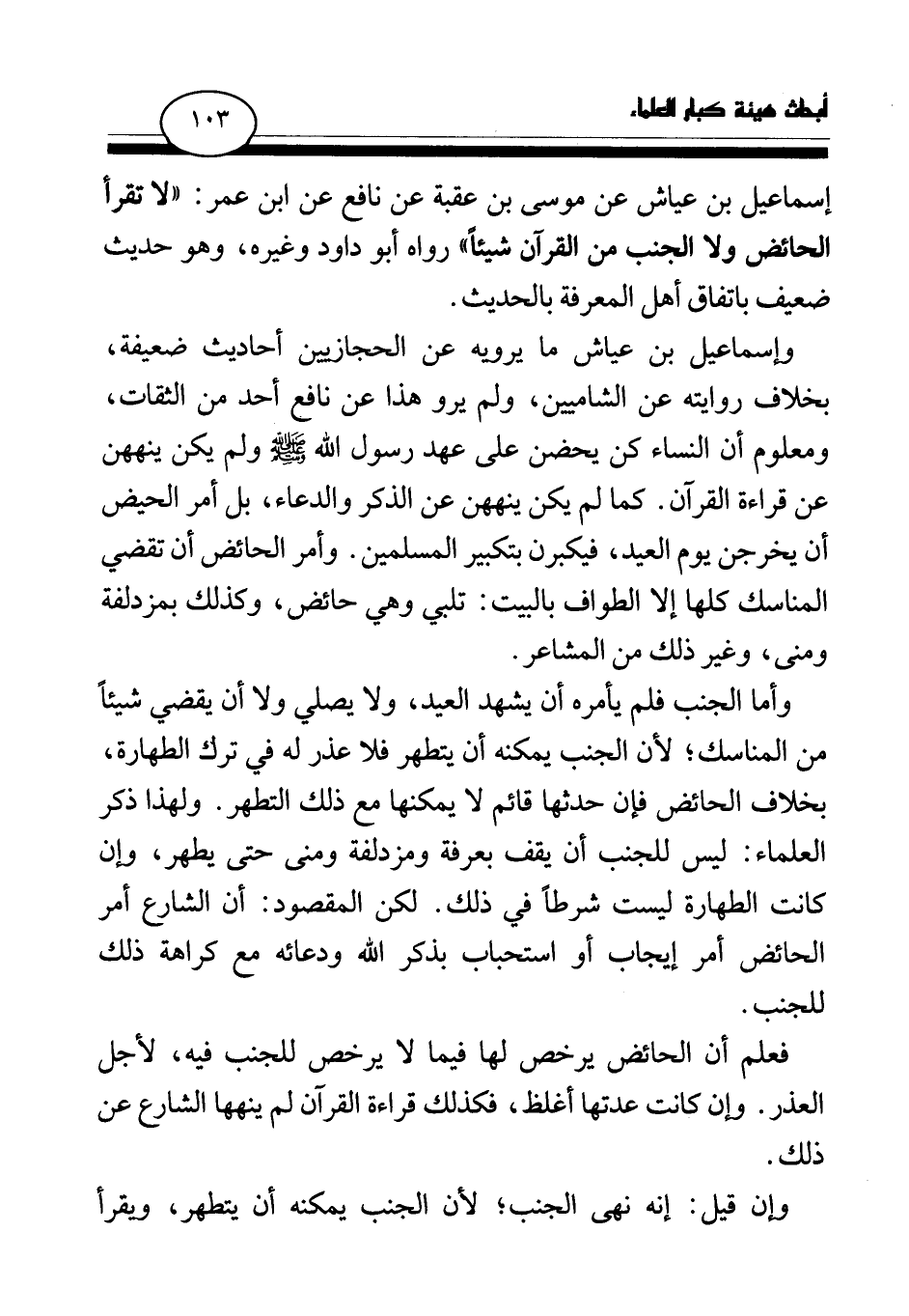 وإسماعيل بن عياش ما يرويه عن الحجازيين أحاديث ضعيفة، بخلاف روايته عن الشاميين، ولم يرو هذا عن نافع أحد من الثقات، ومعلوم أن النساء كن يحضن على عهد رسول الله صلى الله عليه وسلم ولم يكن ينههن عن قراءة القرآن. كما لم يكن ينههن عن الذكر والدعاء، بل أمر الحيض أن يخرجن يوم العيد، فيكبرن بتكبير المسلمين. وأمر الحائض أن تقضي المناسك كلها إلا الطواف بالبيت: تلبي وهي حائض، وكذلك بمزدلفة ومنى، وغير ذلك من المشاعر.
