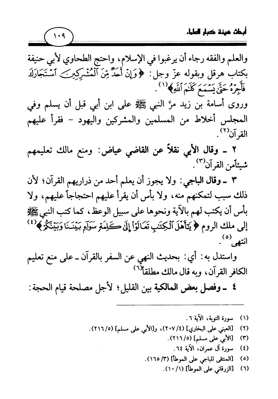 3 - وقال الباجي: ولا يجوز أن يعلم أحد من ذراريهم القرآن؛ لأن ذلك سبب لتمكنهم منه، ولا بأس أن يقرأ عليهم احتجاجا عليهم، ولا بأس أن يكتب لهم بالآية ونحوها على سبيل الوعظ، كما كتب النبي - صلى الله عليه وسلم - إلى ملك الروم: {قُلْ يَا أَهْلَ الْكِتَابِ تَعَالَوْا إِلَى كَلِمَةٍ سَوَاءٍ بَيْنَنَا وَبَيْنَكُمْ} (¬4) انتهى. (¬5) .