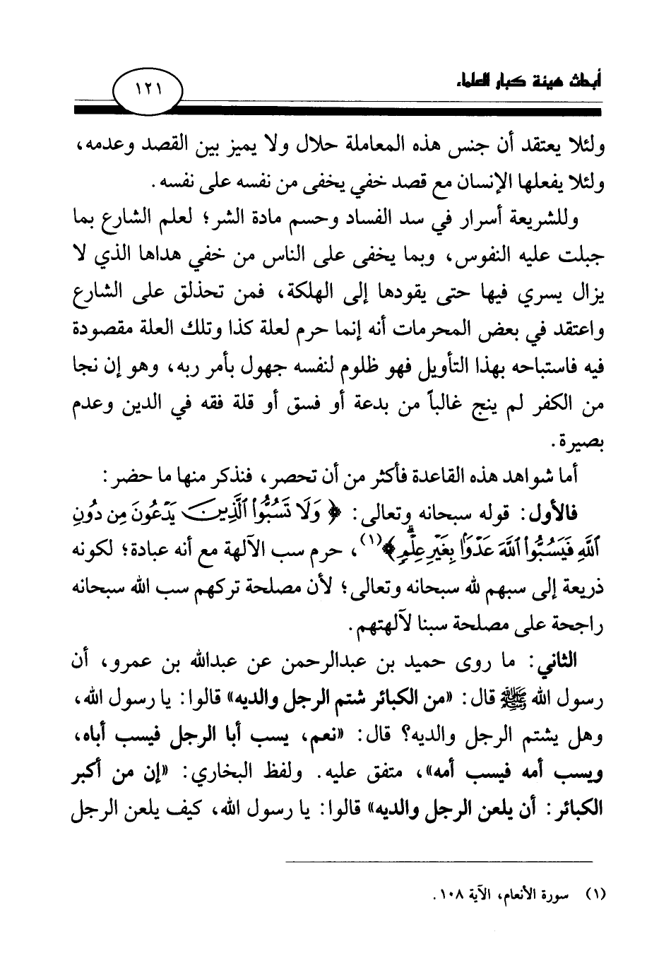 الثاني: ما روى حميد بن عبد الرحمن عن عبد الله بن عمرو، أن رسول الله - صلى الله عليه وسلم - قال: «من الكبائر شتم الرجل والديه. قالوا: يا رسول الله، وهل يشتم الرجل والديه؟ قال: نعم، يسب أبا الرجل فيسب أباه، ويسب أمه فيسب أمه (¬2) » ، متفق عليه. ولفظ البخاري: «إن من أكبر الكبائر: أن يلعن الرجل والديه. قالوا: يا رسول الله، كيف يلعن الرجل