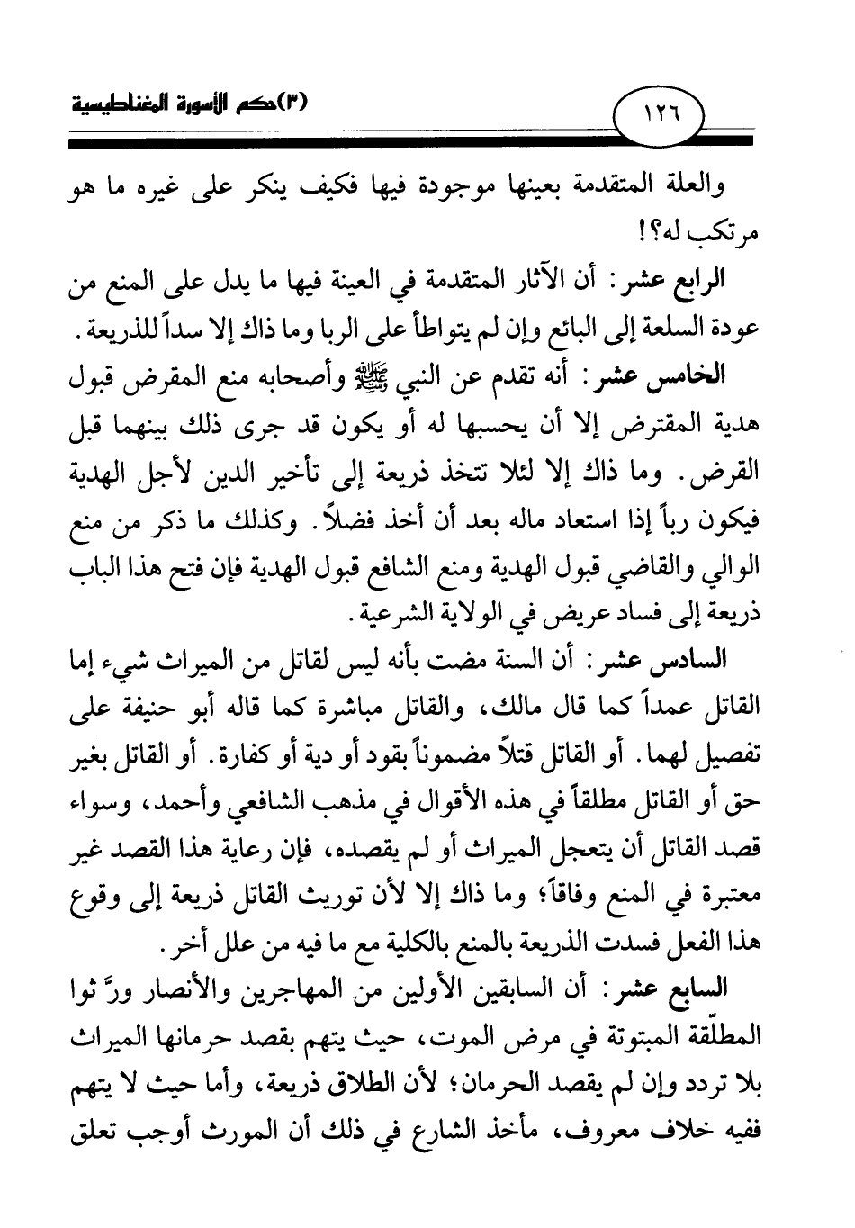 الخامس عشر: أنه تقدم عن النبي صلى الله عليه وسلم وأصحابه منع المقرض قبول هدية المقترض إلا أن يحسبها له، أو يكون قد جرى ذلك بينهما قبل القرض. وما ذاك إلا لئلا تتخذ ذريعة إلى تأخير الدين لأجل الهدية فيكون ربا إذا استعاد ماله بعد أن أخذ فضلا. وكذلك ما ذكر من منع الوالي والقاضي قبول الهدية ومنع الشافع قبول الهدية، فإن فتح هذا الباب ذريعة إلى فساد عريض في الولاية الشرعية.