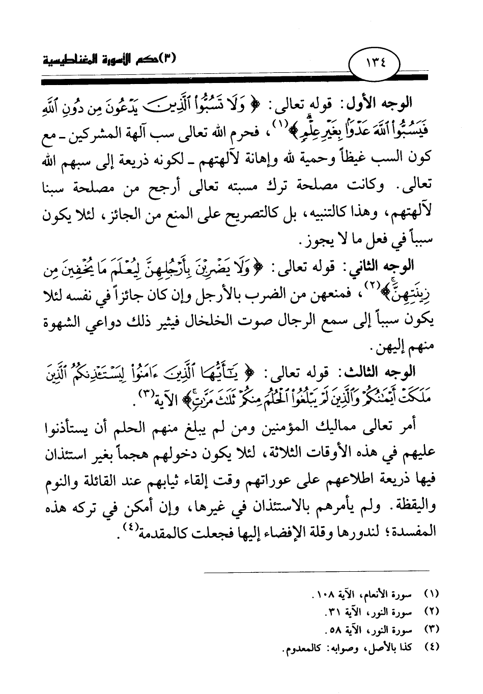 الوجه الثالث: قوله تعالى: {يَا أَيُّهَا الَّذِينَ آمَنُوا لِيَسْتَأْذِنْكُمُ الَّذِينَ مَلَكَتْ أَيْمَانُكُمْ وَالَّذِينَ لَمْ يَبْلُغُوا الْحُلُمَ مِنْكُمْ ثَلَاثَ مَرَّاتٍ} (¬3) الآية.