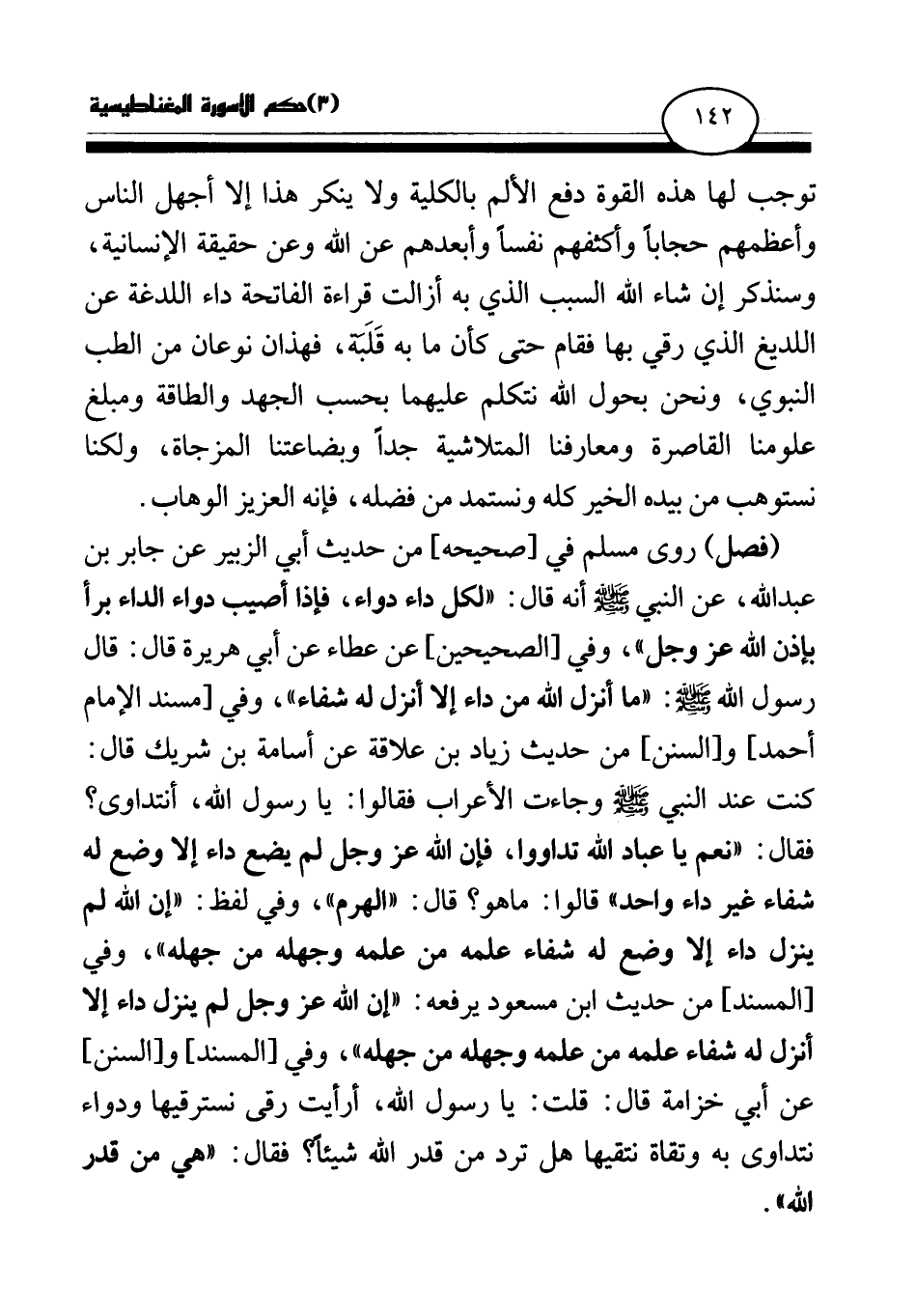 (فصل) روى مسلم في [صحيحه] من حديث أبي الزبير عن جابر بن عبد الله، عن النبي - صلى الله عليه وسلم - أنه قال: «لكل داء دواء، فإذا أصيب دواء الداء برأ بإذن الله عز وجل (¬1) » ، وفي [الصحيحين] عن عطاء عن أبي هريرة قال: قال رسول الله - صلى الله عليه وسلم -: «ما أنزل الله من داء إلا أنزل له شفاء (¬2) » ، وفي [مسند الإمام أحمد] و [السنن] من حديث زياد بن علاقة عن أسامة بن شريك قال: «كنت عند النبي - صلى الله عليه وسلم - وجاءت الأعراب فقالوا: يا رسول الله، أنتداوى؟ فقال: " نعم يا عباد الله تداووا، فإن الله عز وجل لم يضع داء إلا وضع له شفاء غير داء واحد " قالوا: ما هو؟ قال: " الهرم (¬3) » ، وفي لفظ: «إن الله لم ينزل داء إلا وضع له شفاء علمه من علمه وجهله من جهله (¬4) » ، وفي [المسند] من حديث ابن مسعود يرفعه: «إن الله عز وجل لم ينزل داء إلا أنزل له شفاء، علمه من علمه، وجهله من جهله (¬5) » ، وفي [المسند] و [السنن] عن أبي خزامة قال: «قلت: يا رسول الله، أرأيت رقى نسترقيها، وداوء نتداوى به، وتقاة نتقيها، هل ترد من قدر الله شيئا؟ فقال: " هي من قدر الله (¬6) » .