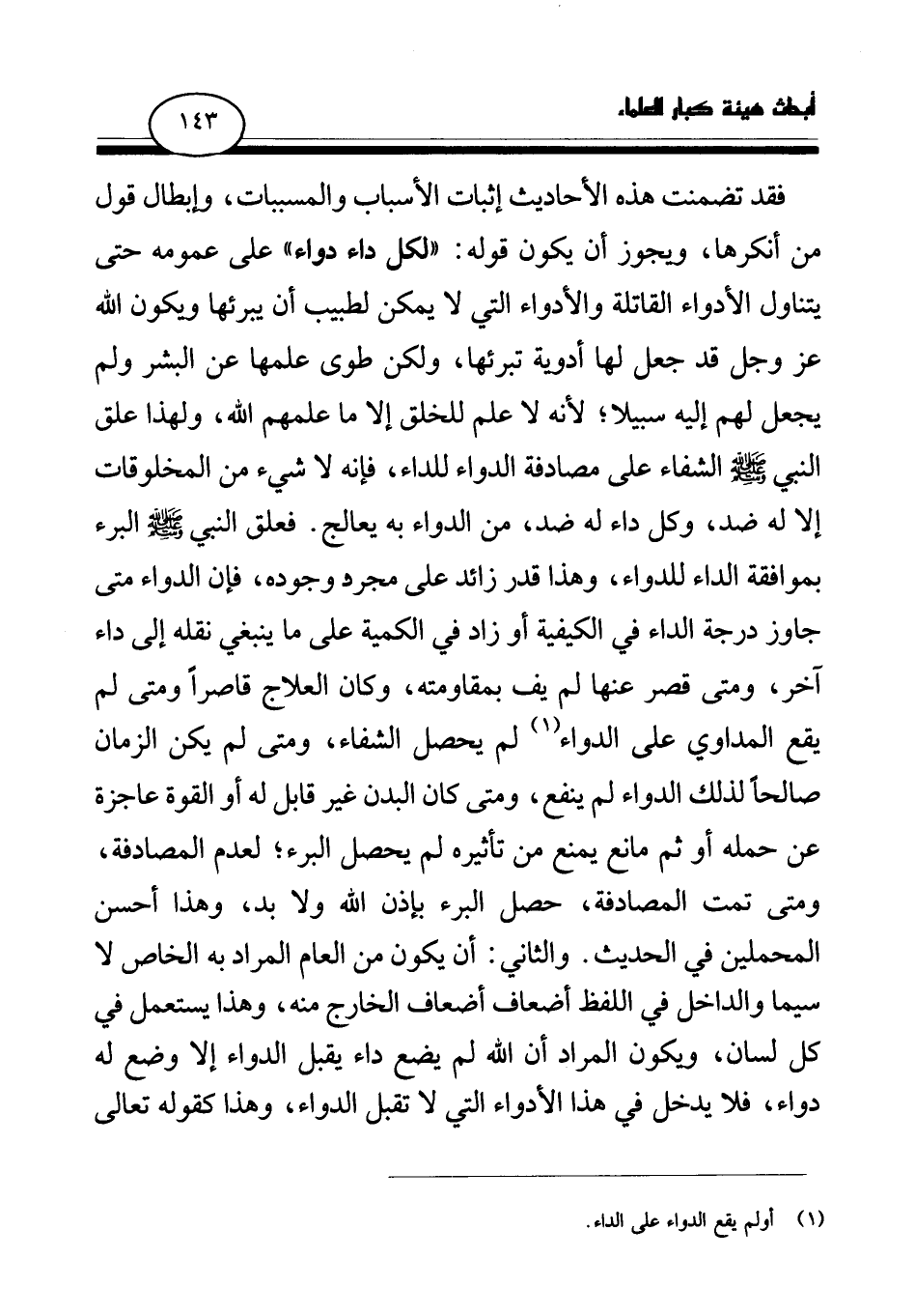 فقد تضمنت هذه الأحاديث إثبات الأسباب والمسببات، وإبطال قول من أنكرها، ويجوز أن يكون قوله: «لكل داء دواء (¬1) » على عمومه حتى يتناول الأدواء القاتلة والأدواء التي لا يمكن لطبيب أن يبرئها، ويكون الله عز وجل قد جعل لها أدوية تبرئها، ولكن طوى علمها عن البشر ولم يجعل لهم إليه سبيلا؛ لأنه لا علم للخلق إلا ما علمهم الله، ولهذا علق النبي - صلى الله عليه وسلم - الشفاء على مصادفة الدواء للداء، فإنه لا شيء من المخلوقات إلا له ضد، وكل داء له ضد، من الدواء به يعالج. فعلق النبي - صلى الله عليه وسلم - البرء بموافقة الداء للدواء، وهذا قدر زائد على مجرد وجوده، فإن الدواء متى جاوز درجة الداء في الكيفية أو زاد في الكمية على ما ينبغي نقله إلى داء آخر، ومتى قصر عنها لم يف بمقاومته، وكان العلاج قاصرا ومتى لم يقع المداوي على الدواء (¬2) لم يحصل الشفاء، ومتى لم يكن الزمان صالحا لذلك الدواء لم ينفع، ومتى كان البدن غير قابل له أو القوة عاجزة عن حمله أو ثم مانع يمنع من تأثيره لم يحصل البرء، لعدم المصادفة، ومتى تمت المصادفة، حصل البرء بإذن الله ولا بد، وهذا أحسن المحملين في الحديث. والثاني: أن يكون من العام المراد به الخاص لا سيما والداخل في اللفظ أضعاف أضعاف الخارج منه، وهذا يستعمل في كل لسان، ويكون المراد أن الله لم يضع داء يقبل الدواء إلا وضع له دواء، فلا يدخل في هذا الأدواء التي لا تقبل الدواء، وهذا كقوله تعالى