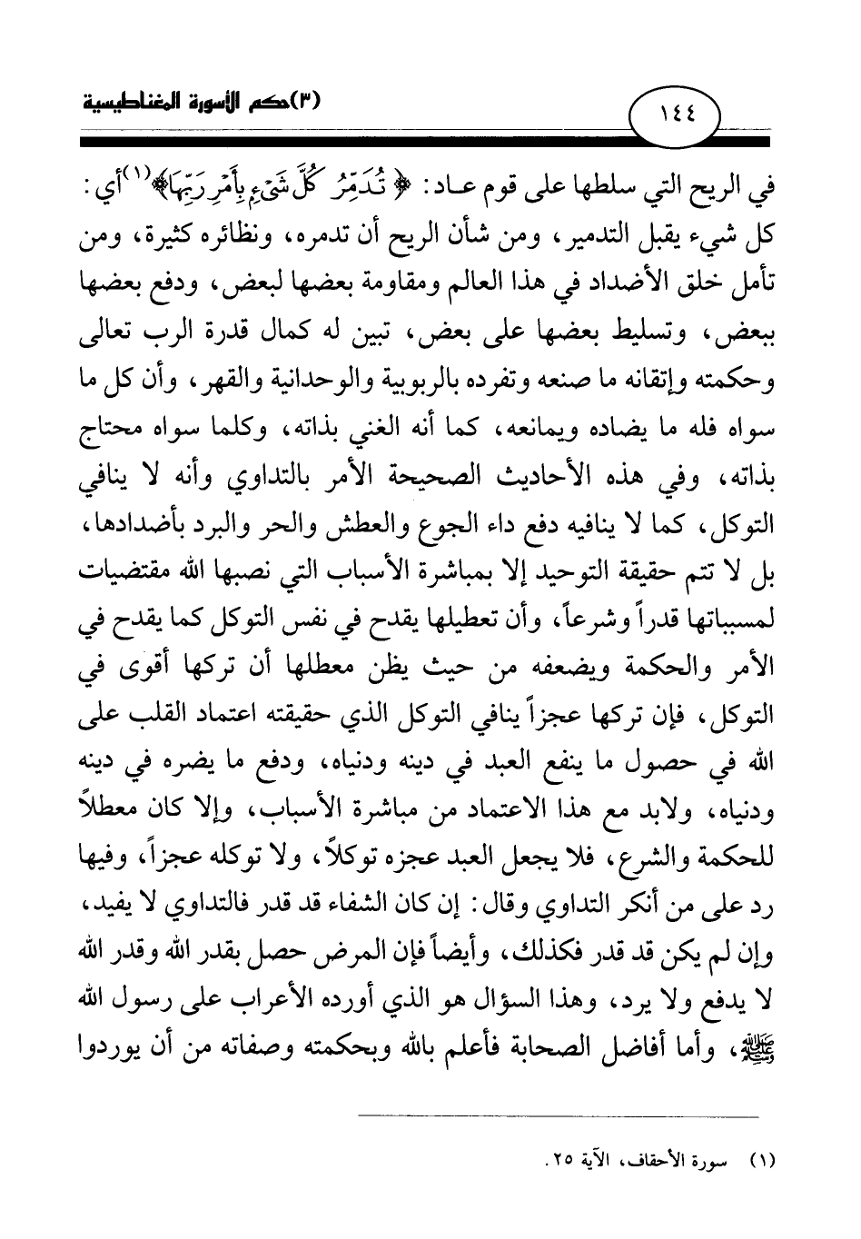 في الريح التي سلطها على قوم عاد: {تُدَمِّرُ كُلَّ شَيْءٍ بِأَمْرِ رَبِّهَا} (¬1) أي: كل شيء يقبل التدمير، ومن شأن الريح أن تدمره، ونظائره كثيرة، ومن تأمل خلق الأضداد في هذا العالم ومقاومة بعضها لبعض، ودفع بعضها ببعض، وتسليط بعضها على بعض، تبين له كمال قدرة الرب تعالى، وحكمته وإتقانه ما صنعه وتفرده بالربوبية والوحدانية والقهر، وأن كل ما سواه فله ما يضاده ويمانعه، كما أنه الغني بذاته، وكلما سواه محتاج بذاته، وفي هذه الأحاديث الصحيحة الأمر بالتداوي وأنه لا ينافي التوكل، كما لا ينافيه دفع داء الجوع والعطش والحر والبرد بأضدادها، بل لا تتم حقيقة التوحيد إلا بمباشرة الأسباب التي نصبها الله مقتضيات لمسبباتها قدرا وشرعا، وأن تعطيلها يقدح في نفس التوكل كما يقدح في الأمر والحكمة ويضعفه من حيث يظن معطلها أن تركها أقوى في التوكل، فإن تركها عجزا ينافي التوكل الذي حقيقته اعتماد القلب على الله في حصول ما ينفع العبد في دينه ودنياه، ودفع ما يضره في دينه ودنياه، ولا بد مع هذا الاعتماد من مباشرة الأسباب، وإلا كان معطلا للحكمة والشرع، فلا يجعل العبد عجزه توكلا، ولا توكله عجزا، وفيها رد على من أنكر التداوي وقال: إن كان الشفاء قد قدر فالتداوي لا يفيد، وإن لم يكن قد قدر فكذلك، وأيضا فإن المرض حصل بقدر الله وقدر الله لا يدفع ولا يرد، وهذا السؤال هو الذي أورده الأعراب على رسول الله - صلى الله عليه وسلم - وأما أفاضل الصحابة فأعلم بالله وبحكمته وصفاته من أن يوردوا