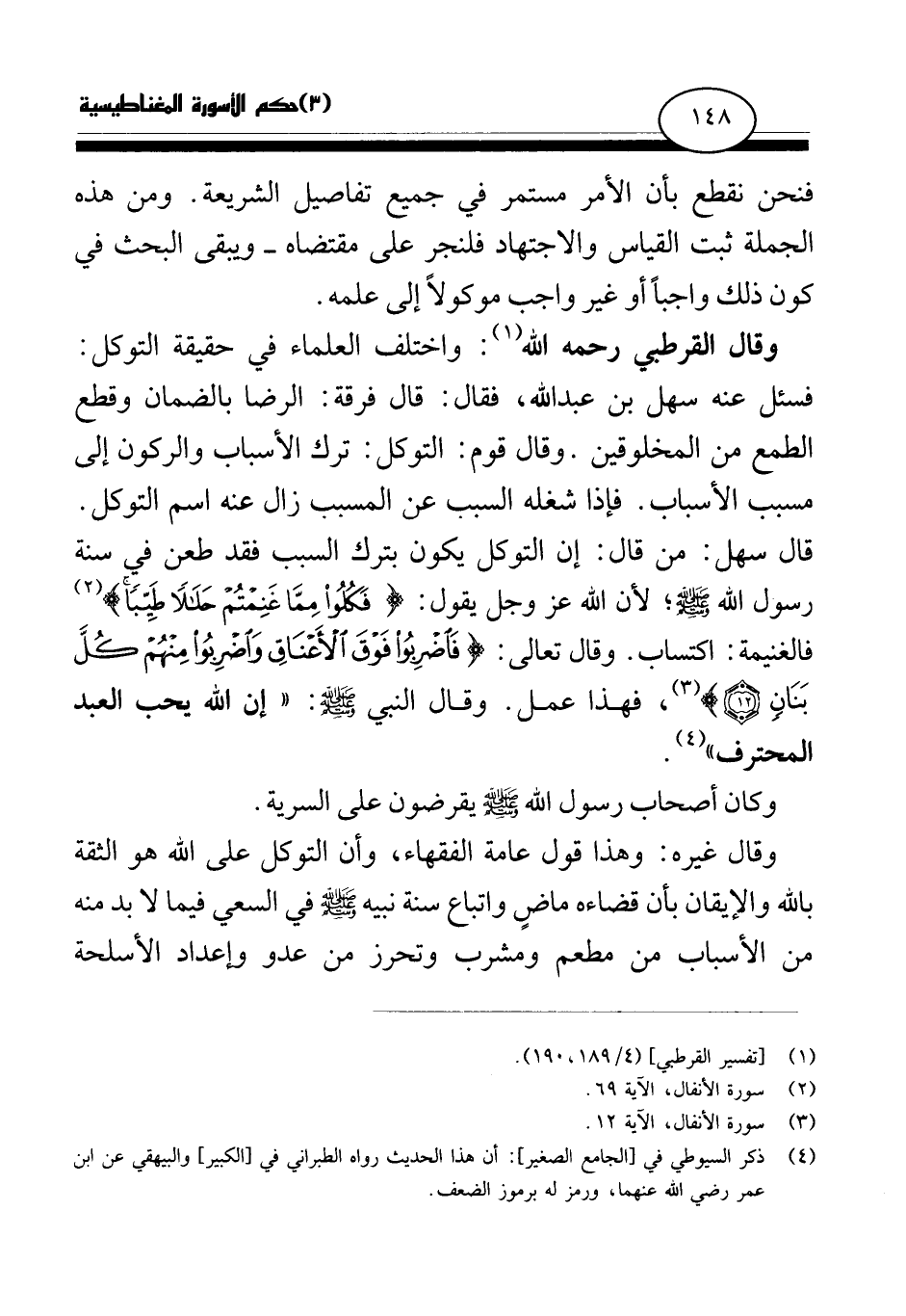 وقال القرطبي رحمه الله (¬1) : واختلف العلماء في حقيقة التوكل: فسئل عنه سهل بن عبد الله، فقال: قال فرقة: الرضا بالضمان وقطع الطمع من المخلوقين. وقال قوم: التوكل: ترك الأسباب والركون إلى مسبب الأسباب. فإذا شغله السبب عن المسبب زال عنه اسم التوكل. قال سهل: من قال: إن التوكل يكون بترك السبب فقد طعن في سنة رسول الله - صلى الله عليه وسلم - لأن الله عز وجل يقول: {فَكُلُوا مِمَّا غَنِمْتُمْ حَلَالًا طَيِّبًا} (¬2) فالغنيمة: اكتساب. وقال تعالى: {فَاضْرِبُوا فَوْقَ الْأَعْنَاقِ وَاضْرِبُوا مِنْهُمْ كُلَّ بَنَانٍ} (¬3) فهذا عمل. وقال النبي - صلى الله عليه وسلم -: «إن الله يحب العبد المحترف (¬4) » .