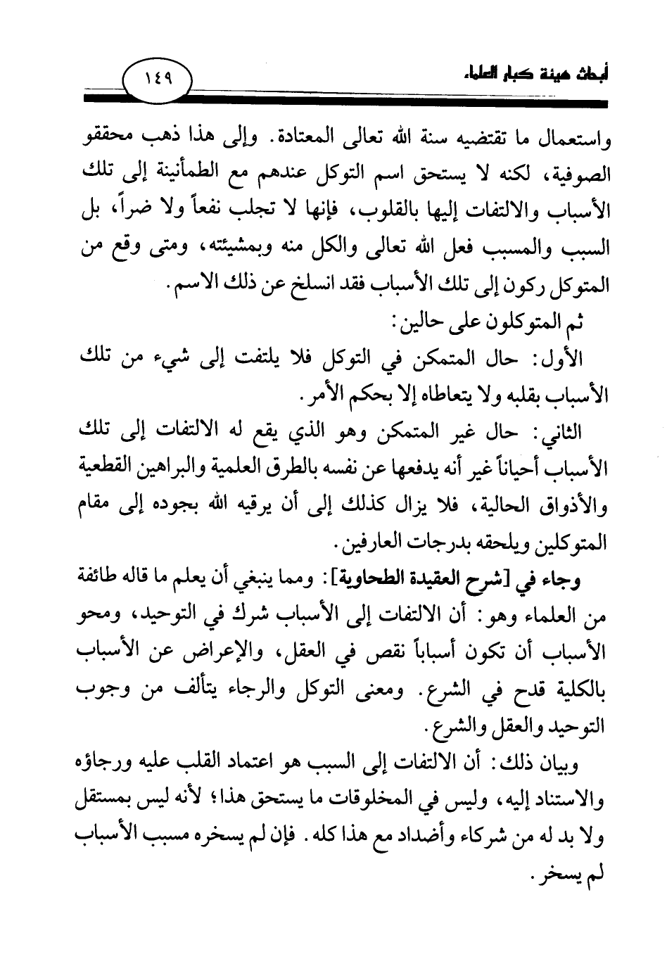 وجاء في [شرح العقيدة الطحاوية] : ومما ينبغي أن يعلم ما قاله طائفة من العلماء وهو: أن الالتفات إلى الأسباب شرك في التوحيد، ومحو الأسباب أن تكون أسبابا نقص في العقل، والإعراض عن الأسباب بالكلية قدح في الشرع. ومعنى التوكل والرجاء يتألف من وجوب التوحيد والعقل والشرع.