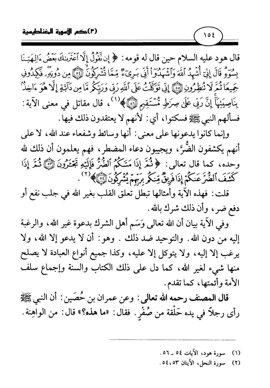 قال المصنف رحمه الله تعالى: وعن عمران بن حصين: «أن النبي صلى الله عليه وسلم رأى رجلا في يده حلقة من صفر، فقال: ما هذه؟ قال: من الواهنة،