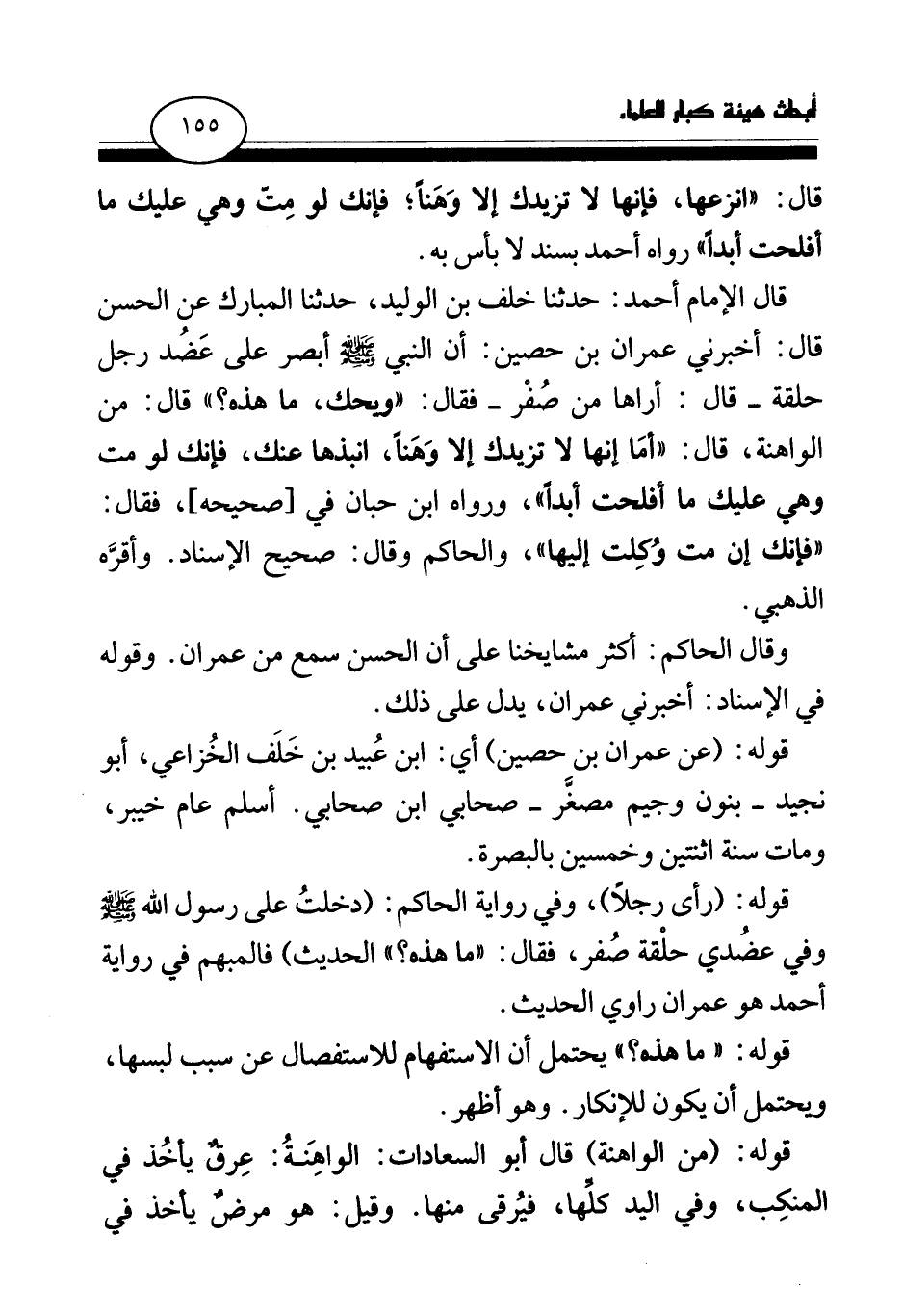 قال الإمام أحمد: حدثنا خلف بن الوليد، حدثنا المبارك عن الحسن قال: أخبرني عمران بن حصين: «أن النبي صلى الله عليه وسلم أبصر على عضد رجل حلقة- قال: أراها من صفر- فقال: ويحك، ما هذه؟ قال: من الواهنة، قال: أما إنها لا تزيدك إلا وهنا، انبذها عنك، فإنك لو مت وهي عليك ما أفلحت أبدا (¬2) » ، ورواه ابن حبان في [صحيحه] ، فقال: «فإنك إن مت وكلت إليها» ، والحاكم وقال: صحيح الإسناد، وأقره الذهبي.