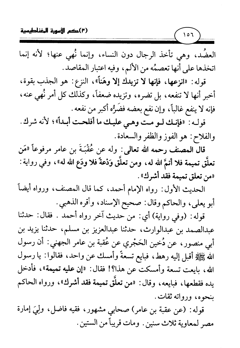قال المصنف رحمه الله تعالى: وله عن عقبة بن عامر مرفوعا: «من تعلق تميمة فلا أتم الله له، ومن تعلق ودعة فلا ودع الله له (¬3) » ، وفي رواية: «من تعلق تميمة فقد أشرك (¬4) » .