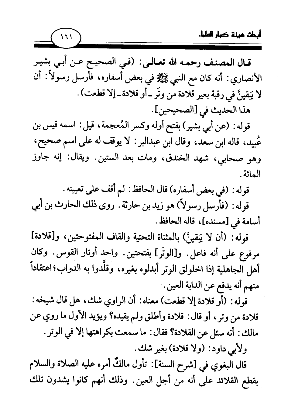 قال المصنف رحمه الله تعالى: (في الصحيح عن أبي بشير الأنصاري: «أنه كان مع النبي صلى الله عليه وسلم في بعض أسفاره، فأرسل رسولا: أن لا يبقين في رقبة بعير قلادة من وتر - أو قلادة - إلا قطعت (¬1) » .