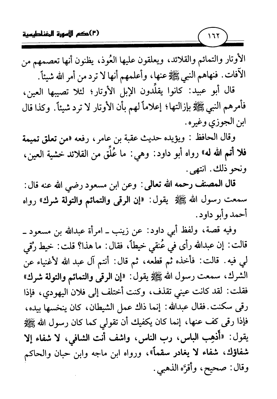 وقال الحافظ: ويؤيده حديث عقبة بن عامر، رفعه «من تعلق تميمة فلا أتم الله له (¬1) » رواه أبو داود: وهي: ما علق من القلائد خشية العين، ونحو ذلك، انتهى.