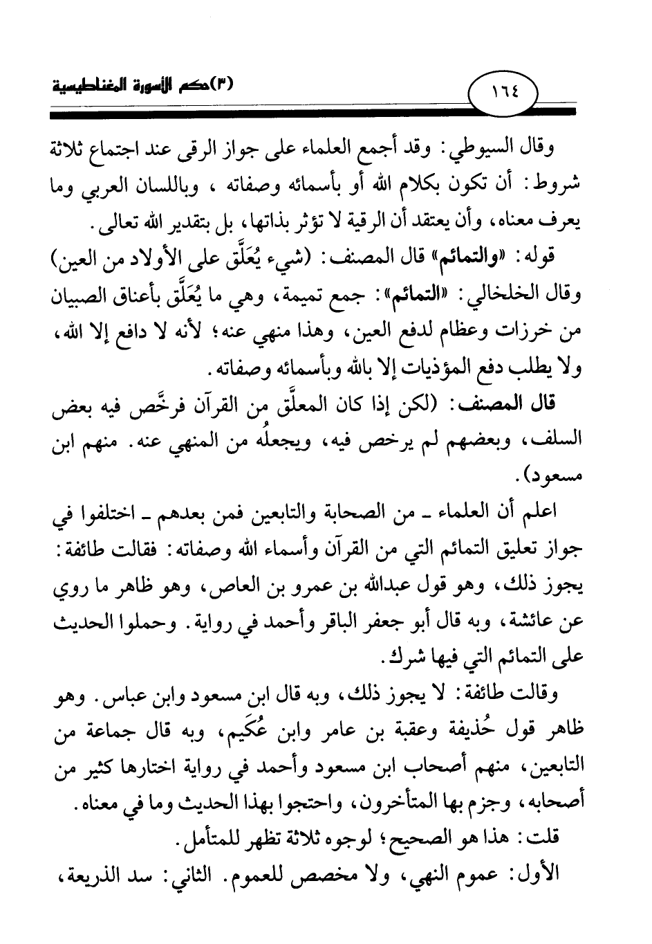 وقال السيوطي: وقد أجمع العلماء على جواز الرقى عند اجتماع ثلاثة شروط: أن تكون بكلام الله أو بأسمائه وصفاته، وباللسان العربي وما يعرف معناه، وأن يعتقد أن الرقية لا تؤثر بذاتها، بل بتقدير الله تعالى.