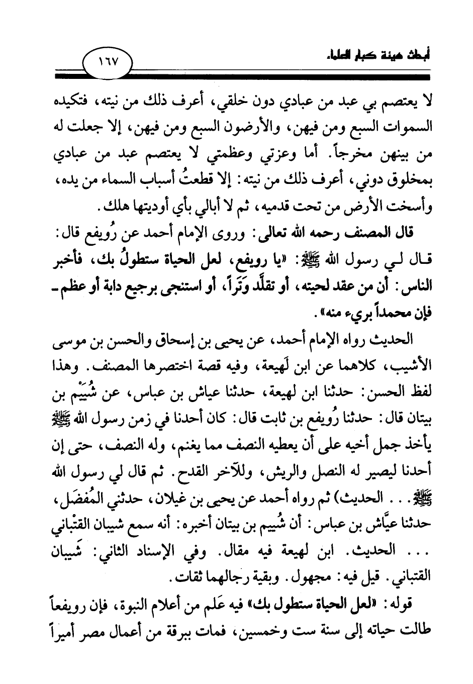 قال المصنف رحمه الله تعالى: وروى الإمام أحمد عن رويفع قال: قال لي رسول الله صلى الله عليه وسلم: «يا رويفع، لعل الحياة ستطول بك، فأخبر الناس: أن من عقد لحيته، أو تقلد وترا، أو استنجى برجيع دابة أو عظم - فإن محمدا بريء منه (¬1) » .