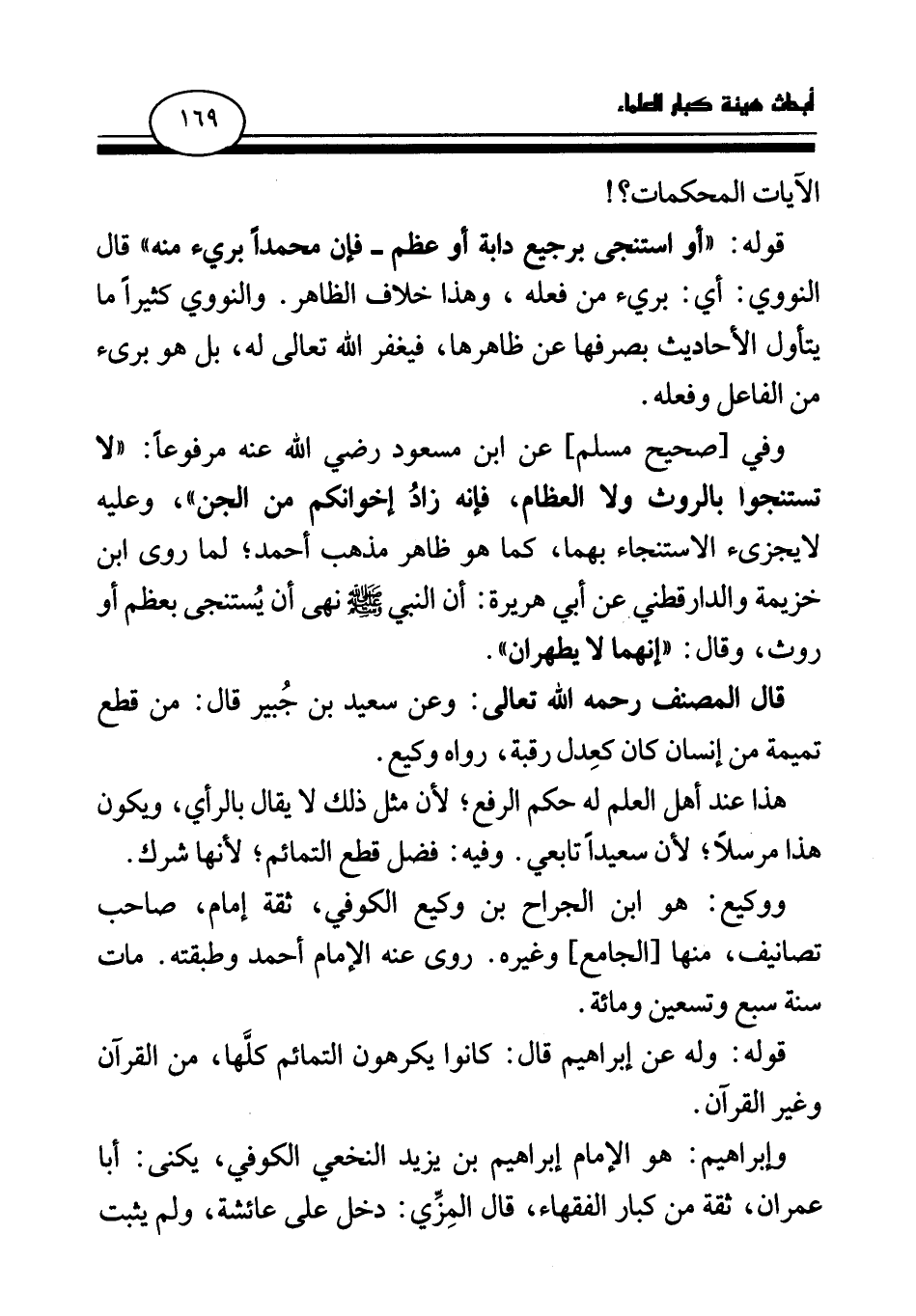 قوله: «أو استنجى برجيع دابة أو عظم- فإن محمدا بريء منه (¬1) » قال النووي: أي: بريء من فعله، وهذا خلاف الظاهر، والنووي كثيرا ما يتأول الأحاديث بصرفها عن ظاهرها، فيغفر الله تعالى له، بل هو بريء من الفاعل وفعله.