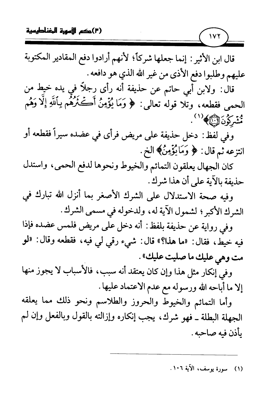 قال: ولابن أبي حاتم عن حذيفة أنه رأى رجلا في يده خيط من الحمى فقطعه، وتلا قوله تعالى: {وَمَا يُؤْمِنُ أَكْثَرُهُمْ بِاللَّهِ إِلَّا وَهُمْ مُشْرِكُونَ} (¬1)