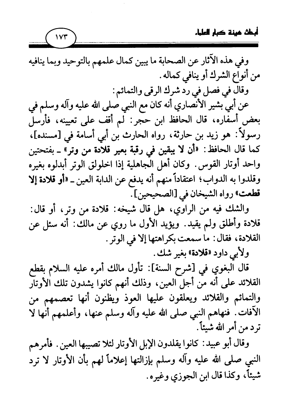 عن أبي بشير الأنصاري «أنه كان مع النبي صلى الله عليه وآله وسلم في بعض أسفاره، (¬1) » قال الحافظ ابن حجر: لم أقف على تعيينه، «فأرسل رسولا» : هو زيد بن حارثة، رواه الحارث بن أبي أسامة في [مسنده] ، كما قال الحافظ: «أن لا يبقين في رقبة بعير قلادة من وتر (¬2) » - بفتحتين واحد أوتار القوس، وكان أهل الجاهلية إذا اخلولق الوتر أبدلوه بغيره وقلدوا به الدواب، اعتقادا منهم أنه يدفع عن الدابة العين- «أو قلادة إلا قطعت (¬3) » رواه الشيخان في [الصحيحين] .