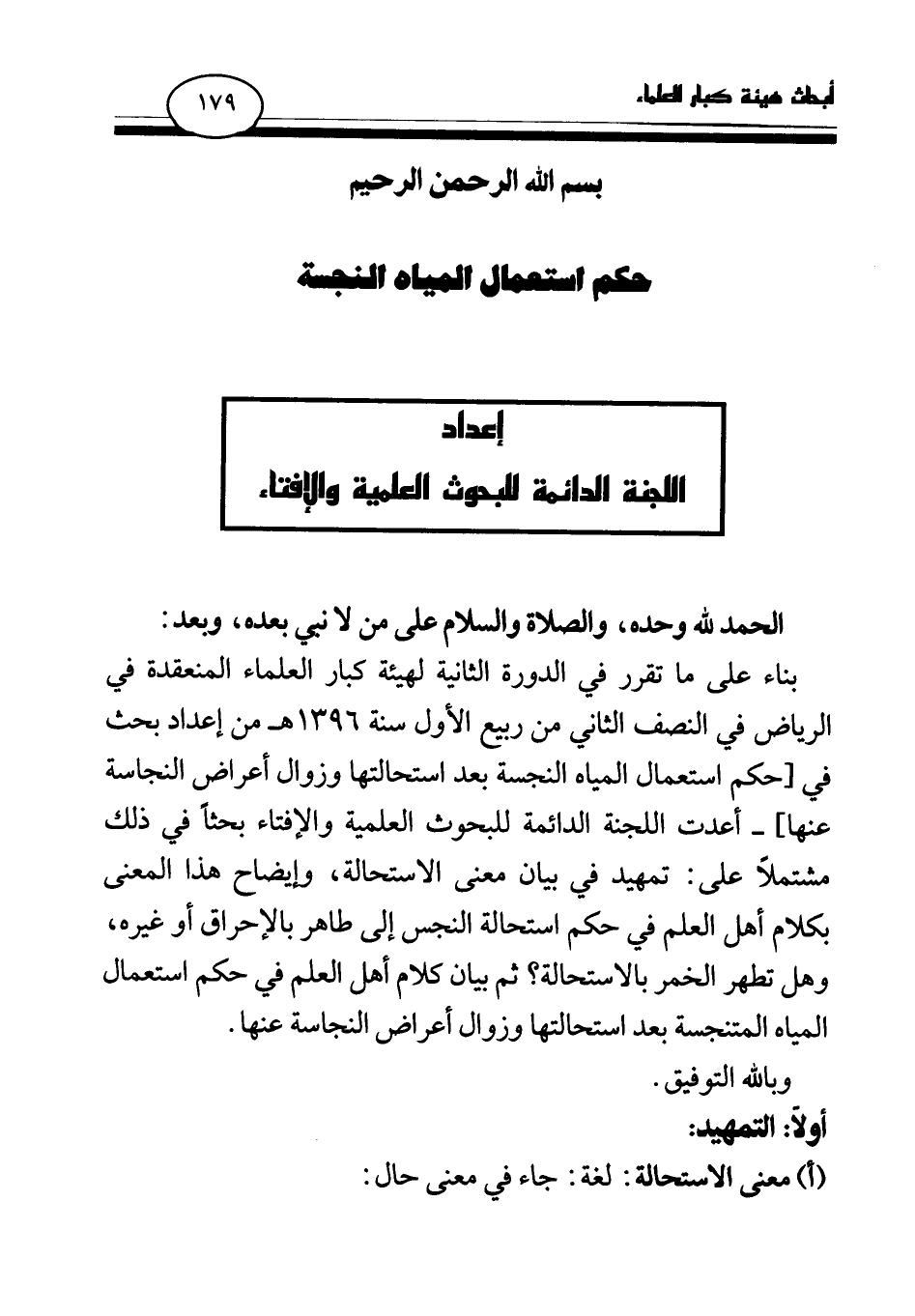 بناء على ما تقرر في الدورة الثانية لهيئة كبار العلماء المنعقدة في الرياض في النصف الثاني من ربيع الأول سنة 1396 هـ من إعداد بحث في [حكم استعمال المياه النجسة بعد استحالتها وزوال أعراض النجاسة عنها]- أعدت اللجنة الدائمة للبحوث العلمية والإفتاء بحثا في ذلك مشتملا على: تمهيد في بيان معنى الاستحالة، وإيضاح هذا المعنى بكلام أهل العلم في حكم استحالة النجس إلى طاهر بالإحراق أو غيره، وهل تطهر الخمر بالاستحالة؟ ثم بيان كلام أهل العلم في حكم استعمال المياه المتنجسة بعد استحالتها وزوال أعراض النجاسة عنها.