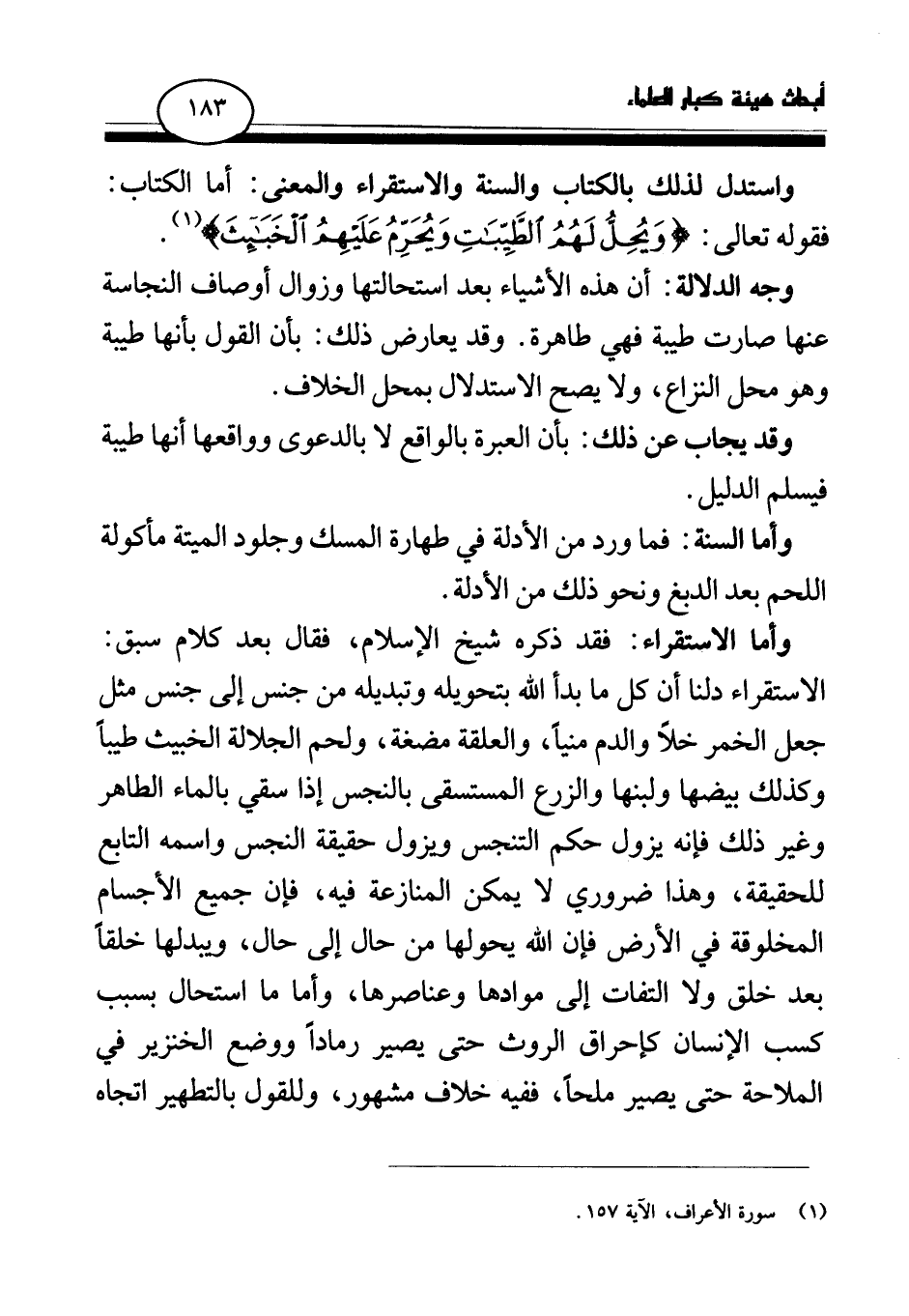 وأما الاستقراء: فقد ذكره شيخ الإسلام، فقال بعد كلام سبق: الاستقراء دلنا أن كل ما بدأ الله بتحويله وتبديله من جنس إلى جنس مثل جعل الخمر خلا والدم منيا، والعلقة مضغة، ولحم الجلالة الخبيث طيبا وكذلك بيضها ولبنها والزرع المستسقى بالنجس إذا سقي بالماء الطاهر وغير ذلك فإنه يزول حكم التنجس ويزول حقيقة النجس واسمه التابع للحقيقة، وهذا ضروري لا يمكن المنازعة فيه، فإن جميع الأجسام المخلوقة في الأرض فإن الله يحولها من حال إلى حال، ويبدلها خلقا بعد خلق ولا التفات إلى موادها وعناصرها، وأما ما استحال بسبب كسب الإنسان كإحراق الروث حتى يصير رمادا ووضع الخنزير في الملاحة حتى يصير ملحا، ففيه خلاف مشهور، وللقول بالتطهير اتجاه