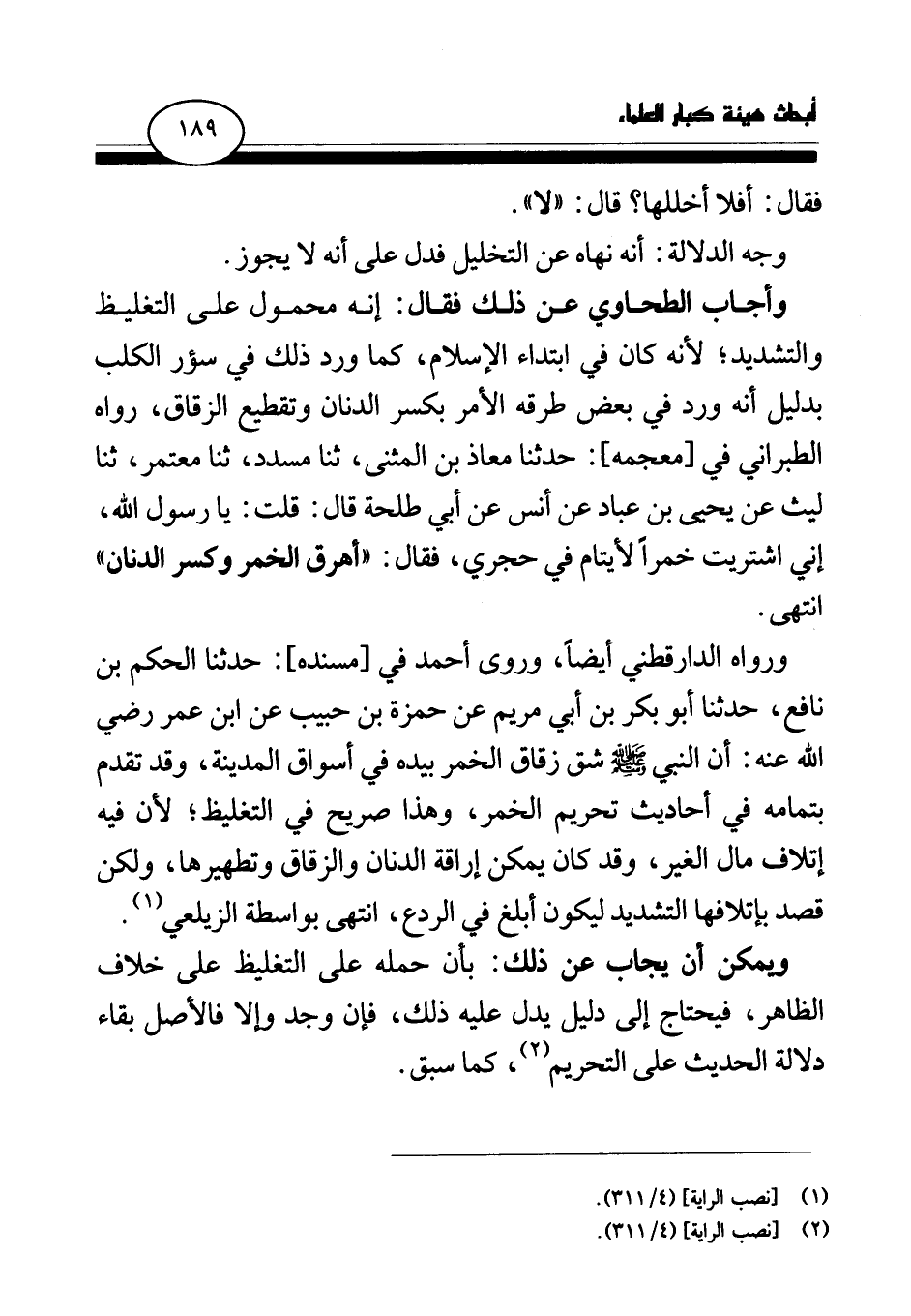 وأجاب الطحاوي عن ذلك فقال: إنه محمول على التغليظ والتشديد؛ لأنه كان في ابتداء الإسلام، كما ورد ذلك في سؤر الكلب بدليل أنه ورد في بعض طرقه الأمر بكسر الدنان وتقطيع الزقاق، رواه الطبراني في [معجمه] : حدثنا معاذ بن المثنى، ثنا مسدد، ثنا معتمر، ثنا ليث عن يحيى بن عباد عن أنس عن أبي طلحة قال: «قلت: يا رسول الله، إني اشتريت خمرا لأيتام في حجري، فقال: أهرق الخمر واكسر الدنان (¬2) » انتهى.