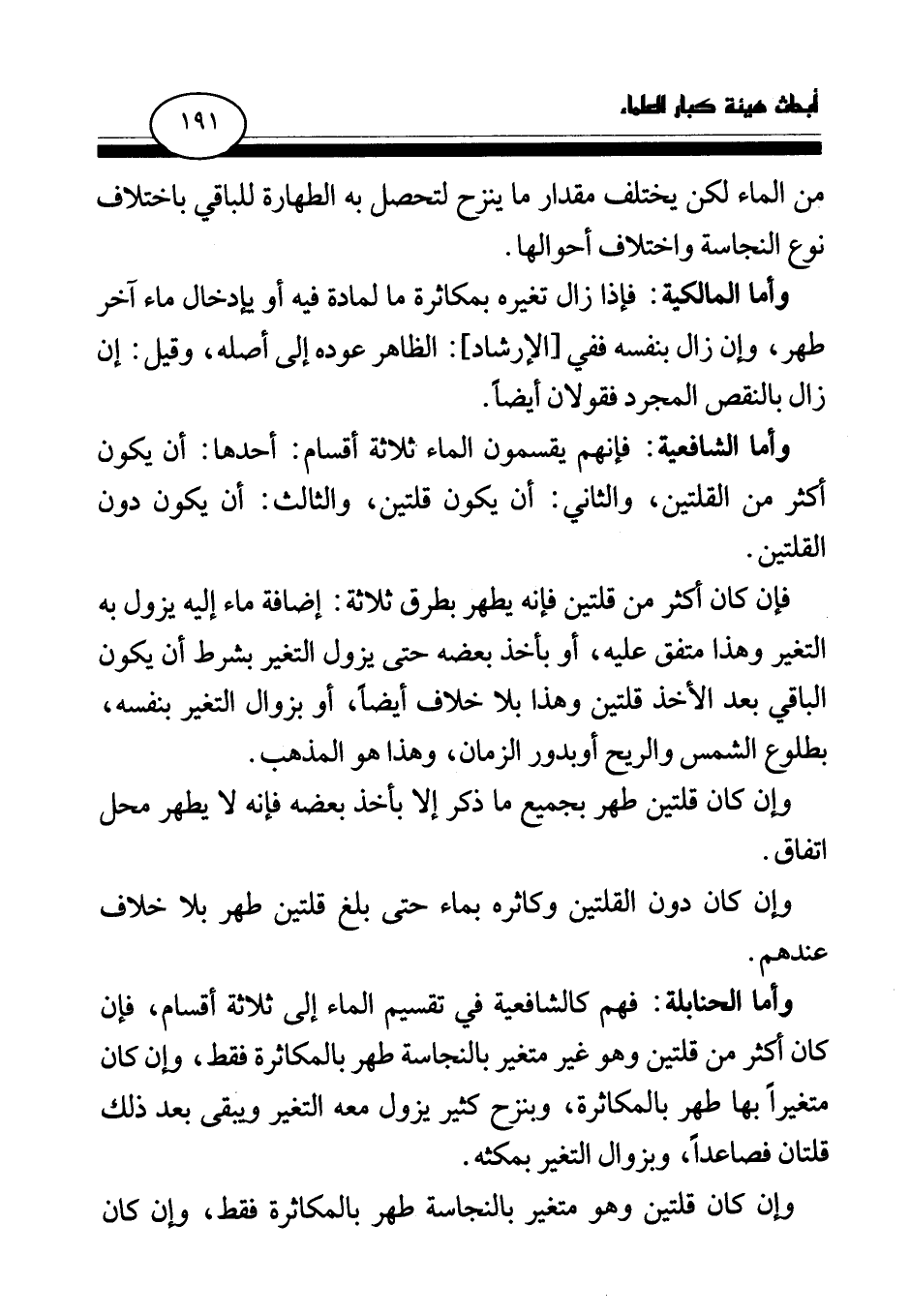 وأما الحنابلة: فهم كالشافعية في تقسيم الماء إلى ثلاثة أقسام، فإن كان أكثر من قلتين وهو غير متغير بالنجاسة طهر بالمكاثرة فقط، وإن كان متغيرا بها طهر بالمكاثرة، وبنزح كثير يزول معه التغير ويبقى بعد ذلك قلتان فصاعدا، وبزوال التغير بمكثه.