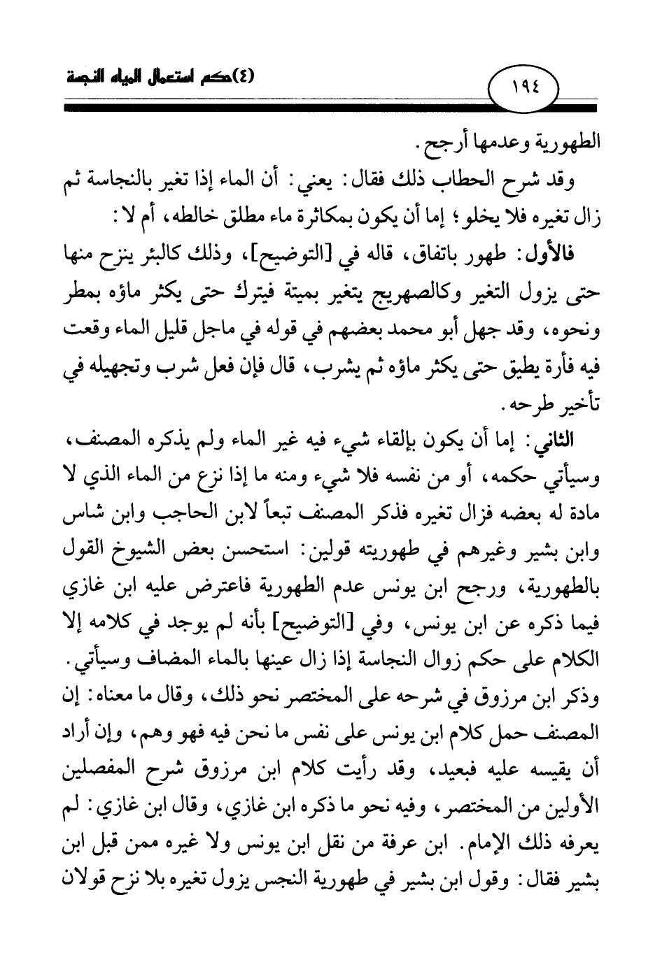 وذكر ابن مرزوق في شرحه على المختصر نحو ذلك، وقال ما معناه: إن المصنف حمل كلام ابن يونس على نفس ما نحن فيه فهو وهم، وإن أراد أن يقيسه عليه فبعيد، وقد رأيت كلام ابن مرزوق شرح المفصلين الأولين من المختصر، وفيه نحو ما ذكره ابن غازي، وقال ابن غازي: لم يعرفه ذلك الإمام، ابن عرفة من نقل ابن يونس ولا غيره ممن قبل ابن بشير فقال: وقول ابن بشير في طهورية النجس يزول تغيره بلا نزح قولان