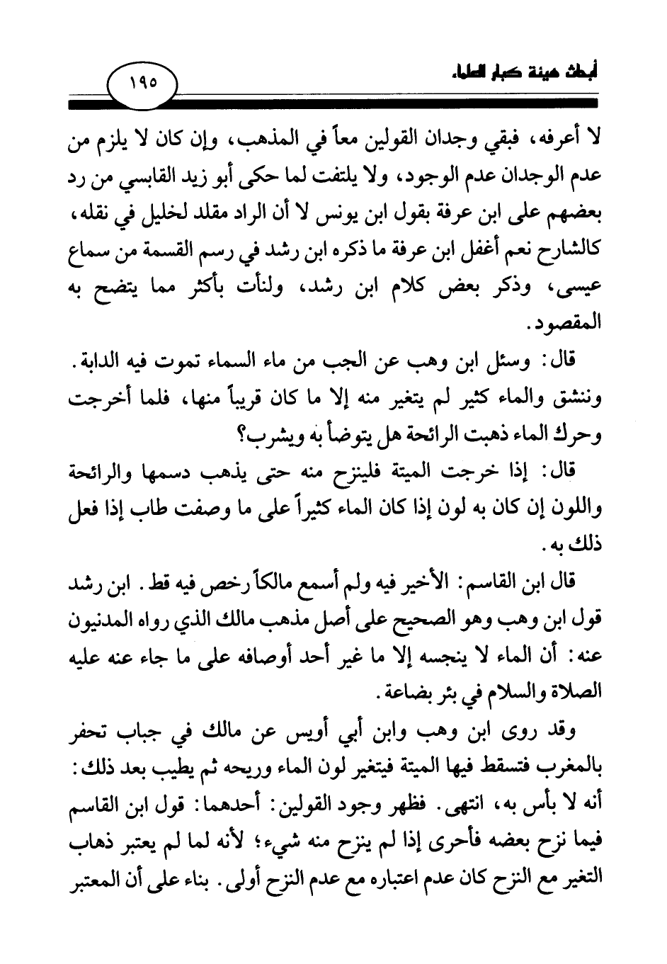 قال ابن القاسم: الأخير فيه ولم أسمع مالكا رخص فيه قط، ابن رشد قول ابن وهب وهو الصحيح على أصل مذهب مالك الذي رواه المدنيون عنه: أن الماء لا ينجسه إلا ما غير أحد أوصافه على ما جاء عنه عليه الصلاة والسلام في بئر بضاعة.