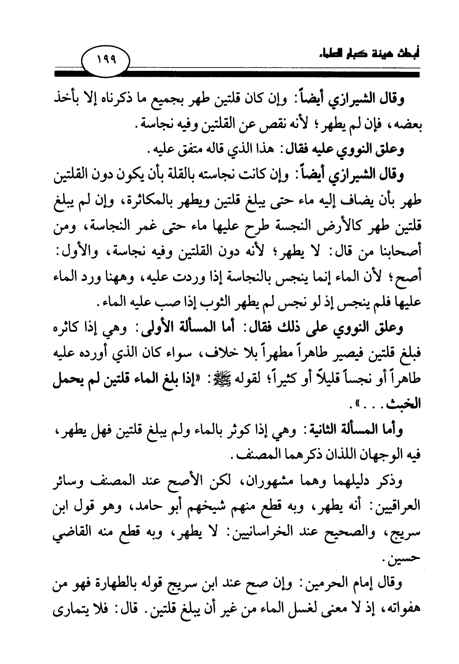 وعلق النووي على ذلك فقال: أما المسألة الأولى: وهي إذا كاثره فبلغ قلتين فيصير طاهرا مطهرا بلا خلاف، سواء كان الذي أورده عليه طاهرا أو نجسا قليلا أو كثيرا؛ لقوله صلى الله عليه وسلم: «إذا بلغ الماء قلتين لم يحمل الخبث (¬1) » . . . .