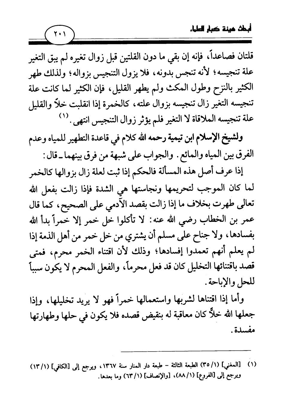 ولشيخ الإسلام ابن تيمية - رحمه الله - كلام في قاعدة التطهير للمياه وعدم الفرق بين المياه والمائع. والجواب على شبهة من فرق بينهما - قال: