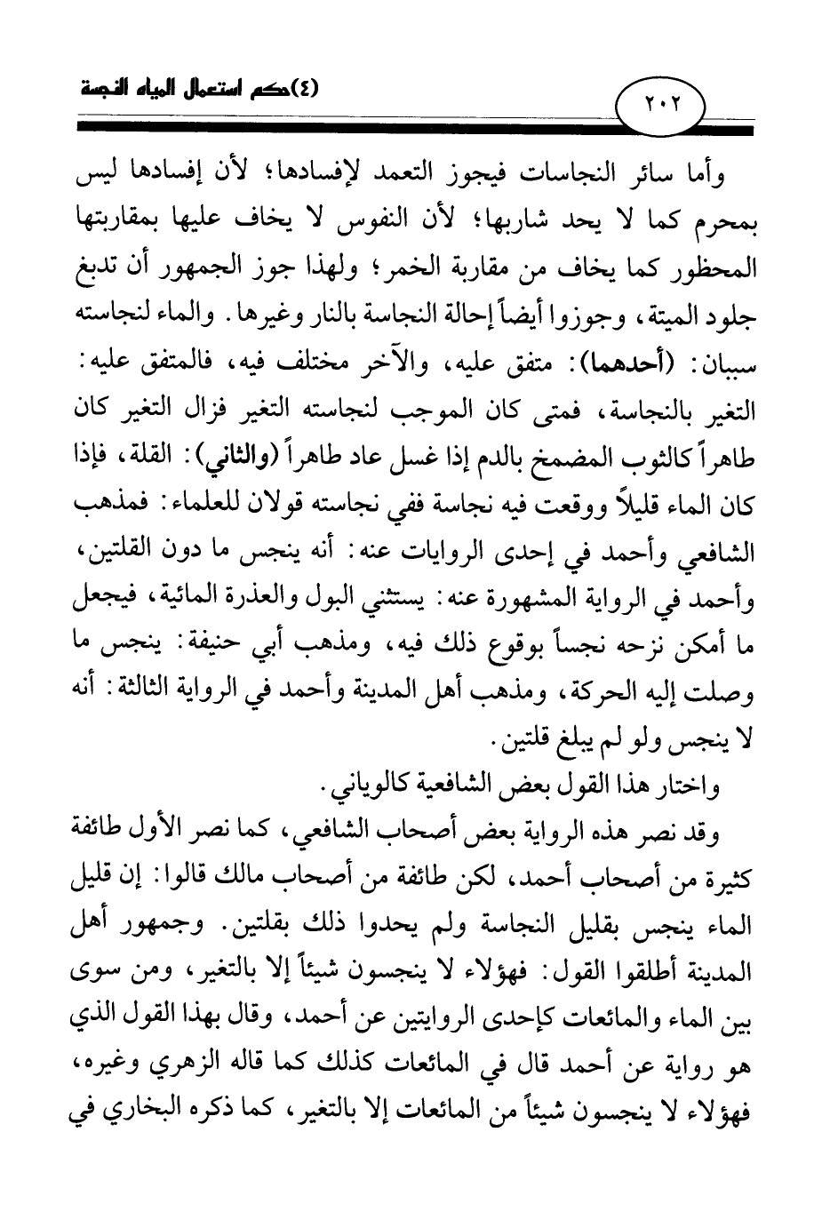 وأما سائر النجاسات فيجوز التعمد لإفسادها؛ لأن إفسادها ليس بمحرم كما لا يحد شاربها؛ لأن النفوس لا يخاف عليها بمقاربتها المحظور كما يخاف من مقاربة الخمر؛ ولهذا جوز الجمهور أن تدبغ جلود الميتة، وجوزوا أيضا إحالة النجاسة بالنار وغيرها. والماء لنجاسته سببان: (أحدهما) : متفق عليه، والآخر مختلف فيه، فالمتفق عليه: التغير بالنجاسة، فمتى كان الموجب لنجاسته التغير فزال التغير كان طاهرا كالثوب المضمخ بالدم إذا غسل عاد طاهرا (والثاني) : القلة، فإذا كان الماء قليلا ووقعت فيه نجاسة ففي نجاسته قولان للعلماء: فمذهب الشافعي وأحمد في إحدى الروايات عنه: أنه ينجس ما دون القلتين، وأحمد في الرواية المشهورة عنه: يستثني البول والعذرة المائية، فيجعل ما أمكن نزحه نجسا بوقوع ذلك فيه، ومذهب أبي حنيفة: ينجس ما وصلت إليه الحركة، ومذهب أهل المدينة وأحمد في الرواية الثالثة: أنه لا ينجس ولو لم يبلغ قلتين.