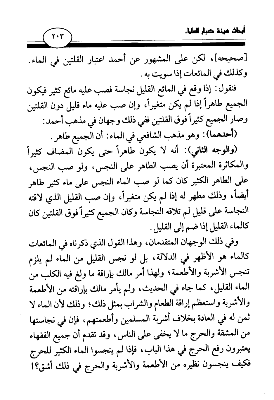 [صحيحه] ، لكن على المشهور عن أحمد اعتبار القلتين في الماء. وكذلك في المائعات إذا سويت به.