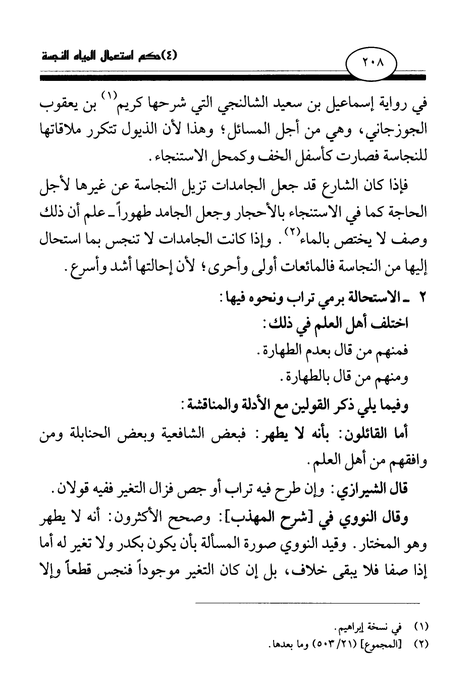 فإذا كان الشارع قد جعل الجامدات تزيل النجاسة عن غيرها لأجل الحاجة كما في الاستنجاء بالأحجار وجعل الجامد طهورا - علم أن ذلك وصف لا يختص بالماء (¬2) . وإذا كانت الجامدات لا تنجس بما استحال إليها من النجاسة فالمائعات أولى وأحرى؛ لأن إحالتها أشد وأسرع.