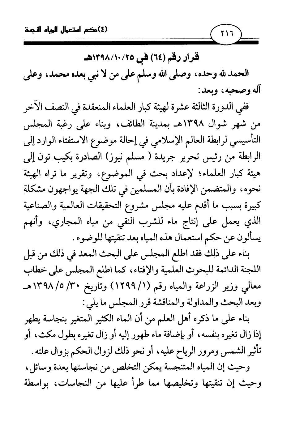 ففي الدورة الثالثة عشرة لهيئة كبار العلماء المنعقدة في النصف الآخر من شهر شوال 1398 هـ بمدينة الطائف، وبناء على رغبة المجلس التأسيسي لرابطة العالم الإسلامي في إحالة موضوع الاستفتاء الوارد إلى الرابطة من رئيس تحرير جريدة (مسلم نيوز) الصادرة بكيب تون إلى هيئة كبار العلماء؛ لإعداد بحث في الموضوع، وتقرير ما تراه الهيئة نحوه، والمتضمن الإفادة بأن المسلمين في تلك الجهة يواجهون مشكلة كبيرة بسبب ما أقدم عليه مجلس مشروع التحقيقات العالمية والصناعية الذي يعمل على إنتاج ماء للشرب النقي من مياه المجاري، وأنهم يسألون عن حكم استعمال هذه المياه بعد تنقيتها للوضوء.