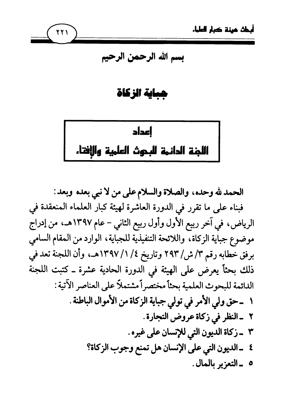 فبناء على ما تقرر في الدورة العاشرة لهيئة كبار العلماء المنعقدة في الرياض، في آخر ربيع الأول وأول ربيع الثاني - عام 1397 هـ، من إدراج موضوع جباية الزكاة، واللائحة التنفيذية للجباية، الوارد من المقام السامي برفق خطابه رقم 3 \ ش \ 293 وتاريخ 4 \ 1 \ 1397 هـ، وأن اللجنة تعد في ذلك بحثا يعرض على الهيئة في الدورة الحادية عشرة - كتبت اللجنة الدائمة للبحوث العلمية بحثا مختصرا مشتملا على العناصر الآتية: