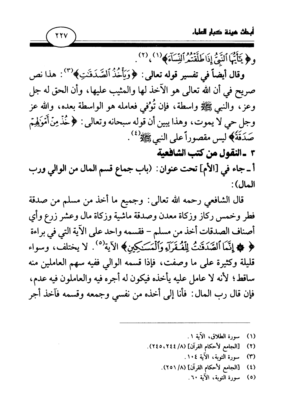 وقال أيضا في تفسير قول تعالى: {وَيَأْخُذُ الصَّدَقَاتِ} (¬3) هذا نص صريح في أن الله تعالى هو الآخذ لها والمثيب عليها، وأن الحق له جل وعز، والنبي صلى الله عليه وسلم واسطة، فإن توفي فعامله هو الواسطة بعده، والله عز وجل حي لا يموت، وهذا يبين أن قوله سبحانه وتعالى: {خُذْ مِنْ أَمْوَالِهِمْ صَدَقَةً} (¬4) ليس مقصورا على النبي صلى الله عليه وسلم (¬5) .