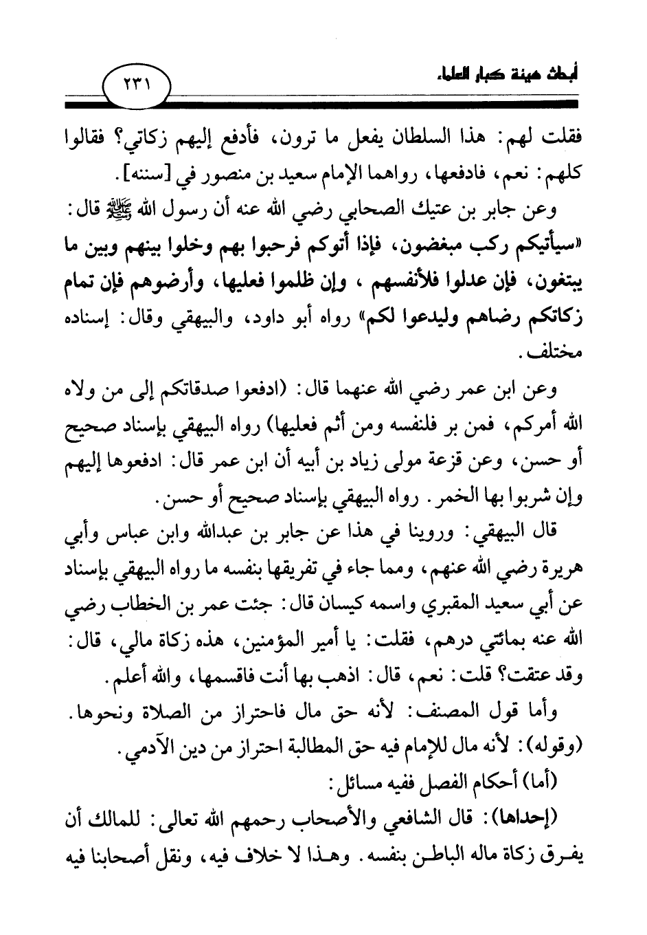 وعن ابن عمر رضي الله عنهما قال: (ادفعوا صدقاتكم إلى من ولاه الله أمركم، فمن بر فلنفسه ومن أثم فعليها) رواه البيهقي بإسناد صحيح أو حسن، وعن قزعة مولى زياد بن أبيه أن ابن عمر قال: ادفعوها إليهم وان شربوا بها الخمر. رواه البيهقي بإسناد صحيح أو حسن.