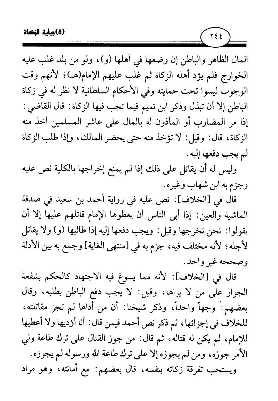 قال في [الخلاف] : لأنه مما يسوغ فيه الاجتهاد كالحكم بشفعة الجوار على من لا يراها، وقيل: لا يجب دفع الباطن بطلبه، وقال بعضهم: وجها واحدا، وذكر شيخنا: أن من أداها لم تجز مقاتلته، للخلاف في إجزائها، ثم ذكر نص أحمد فيمن قال: أنا أؤديها ولا أعطيها للإمام، لم يكن له قتاله، ثم قال: من جوز القتال على ترك طاعة ولي الأمر جوزه، ومن لم يجوزه إلا على ترك طاعة الله ورسوله لم يجوزه.