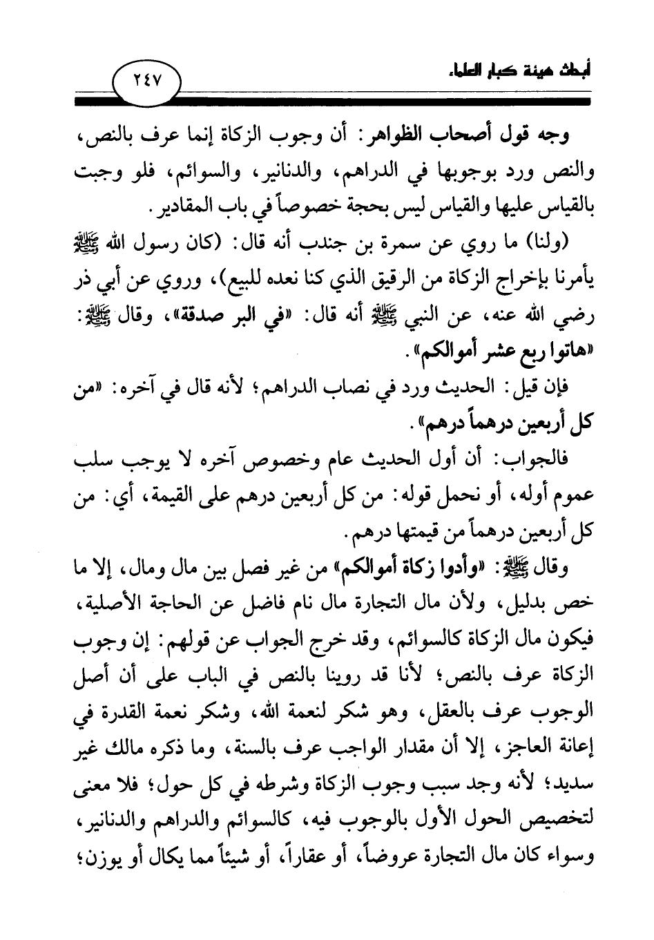 وقال صلى الله عليه وسلم: «وأدوا زكاة أموالكم (¬3) » من غير فصل بين مال ومال، إلا ما خص بدليل، ولأن مال التجارة مال نام فاضل عن الحاجة الأصلية، فيكون مال الزكاة كالسوائم، وقد خرج الجواب عن قولهم: إن وجوب الزكاة عرف بالنص؛ لأنا قد روينا بالنص في الباب على أن أصل الوجوب عرف بالعقل، وهو شكر لنعمة الله، وشكر نعمة القدرة في إعانة العاجز، إلا أن مقدار الواجب عرف بالسنة، وما ذكره مالك غير سديد؛ لأنه وجد سبب وجوب الزكاة وشرطه في كل حول؛ فلا معنى لتخصيص الحول الأول بالوجوب فيه، كالسوائم والدراهم والدنانير، وسواء كان مال التجارة عروضا، أو عقارا، أو شيئا مما يكال أو يوزن؛
