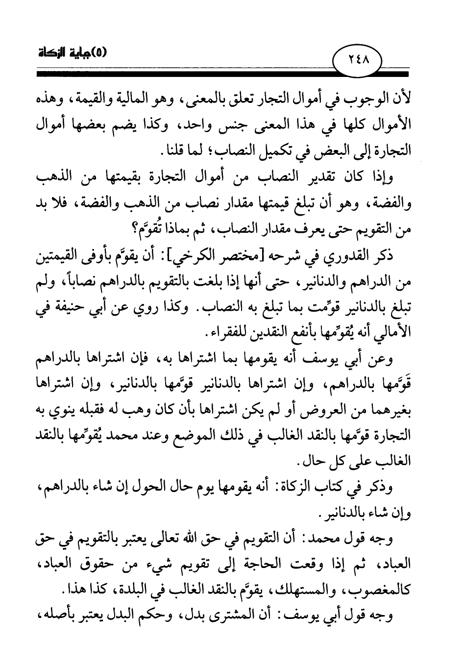 ذكر القدوري في شرحه [مختصر الكرخي] : أن يقوم بأوفى القيمتين من الدراهم والدنانير، حتى أنها إذا بلغت بالتقويم بالدراهم نصابا، ولم تبلغ بالدنانير قومت بما تبلغ به النصاب. وكذا روي عن أبي حنيفة في الأمالي أنه يقومها بأنفع النقدين للفقراء.