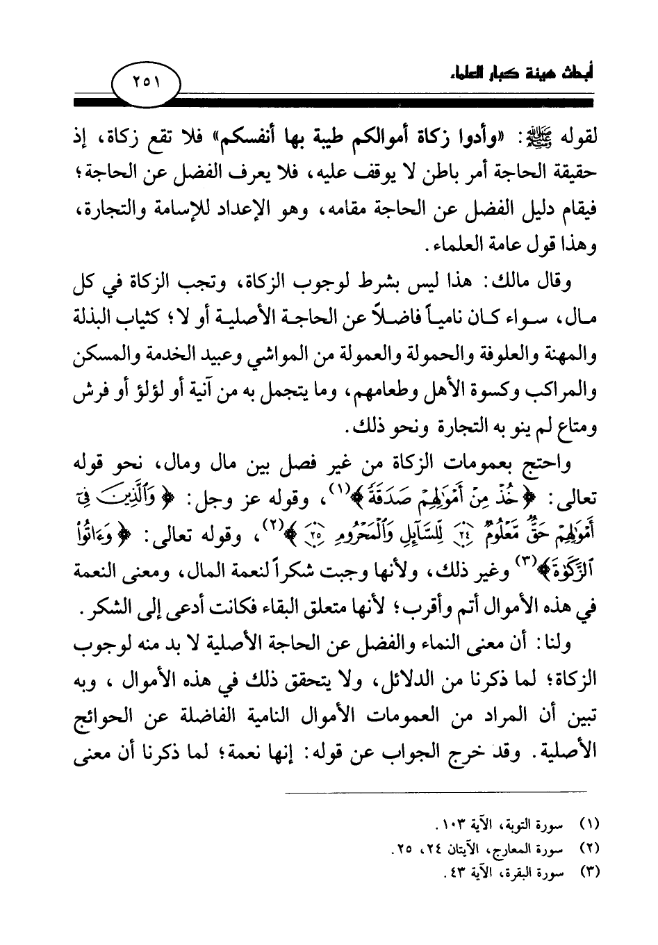واحتج بعمومات الزكاة من غير فصل بين مال ومال، نحو قوله تعالى: {خُذْ مِنْ أَمْوَالِهِمْ صَدَقَةً} (¬2) وقوله عز وجل: {وَالَّذِينَ فِي أَمْوَالِهِمْ حَقٌّ مَعْلُومٌ} (¬3) {لِلسَّائِلِ وَالْمَحْرُومِ} (¬4) وقوله تعالى: {وَآتُوا الزَّكَاةَ} (¬5) وغير ذلك؛ ولأنها وجبت شكرا لنعمة المال، ومعنى النعمة في هذه الأموال أتم وأقرب؛ لأنها متعلق البقاء فكانت أدعى إلى الشكر.