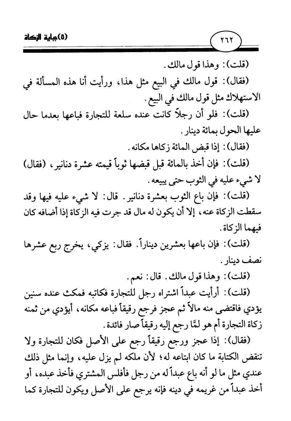 (قلت) : فإن باع الثوب بعشرة دنانير. قال: لا شيء عليه فيها وقد سقطت الزكاة عنه، إلا أن يكون له مال قد جرت فيه الزكاة إذا أضافه كان فيهما الزكاة.