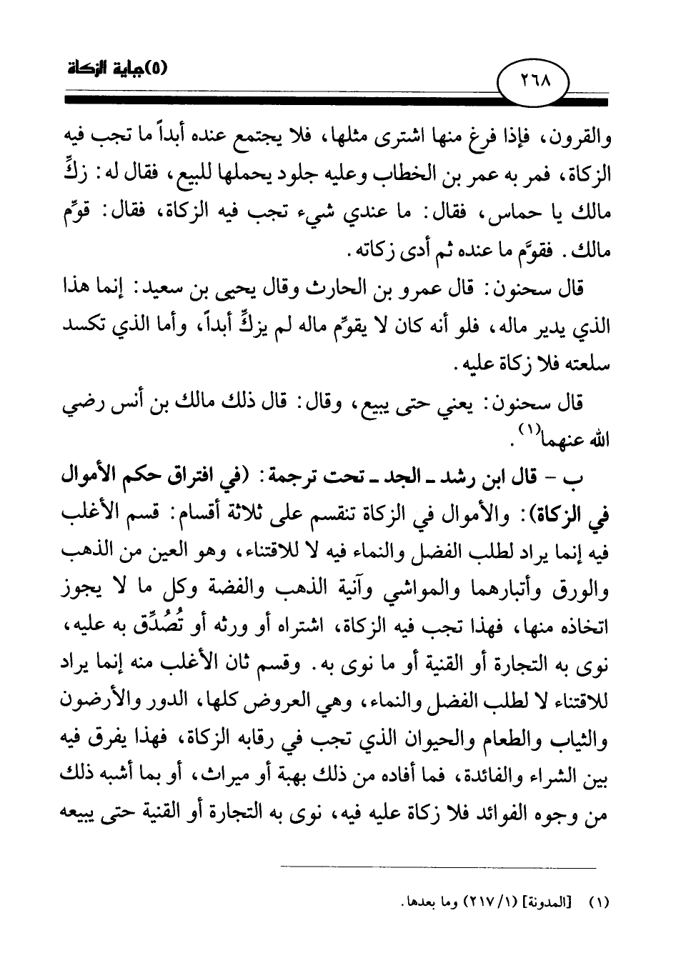 ب - قال ابن رشد - الجد - تحت ترجمة: (في افتراق حكم الأموال في الزكاة) : والأموال في الزكاة تنقسم على ثلاثة أقسام: قسم الأغلب فيه إنما يراد لطلب الفضل والنماء فيه لا للاقتناء، وهو العين من المذهب والورق وأتبارهما والمواشي وآنية الذهب والفضة وكل ما لا يجوز اتخاذه منها، فهذا تجب فيه الزكاة، اشتراه أو ورثه أو تصدق به عليه، نوى به التجارة أو القنية أو ما نوى به. وقسم ثان الأغلب منه إنما يراد للاقتناء لا لطلب الفضل والنماء، وهي العروض كلها، الدور والأرضون والثياب والطعام والحيوان الذي تجب في رقابه الزكاة، فهذا يفرق فيه بين الشراء والفائدة، فما أفاده من ذلك بهبة أو ميراث، أو بما أشبه ذلك من وجوه الفوائد فلا زكاة عليه فيه، نوى به التجارة أو القنية حتى يبيعه