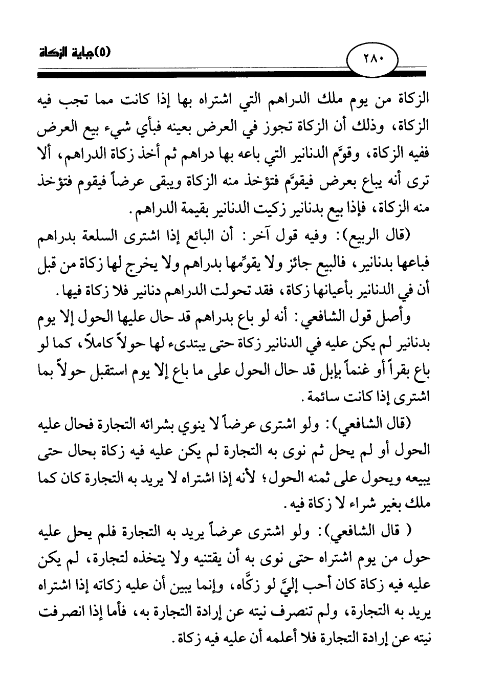 (قال الربيع) : وفيه قول آخر: أن البائع إذا اشترى السلعة بدراهم فباعها بدنانير، فالبيع جائز ولا يقومها بدراهم ولا يخرج لها زكاة من قبل أن في الدنانير بأعيانها زكاة، فقد تحولت الدراهم دنانير فلا زكاة فيها.