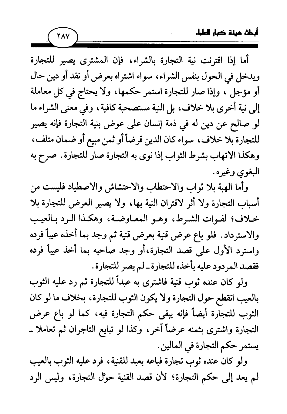 أما إذا اقترنت نية التجارة بالشراء، فإن المشترى يصير للتجارة ويدخل في الحول بنفس الشراء، سواء اشتراه بعرض أو نقد أو دين حال أو مؤجل، وإذا صار للتجارة استمر حكمها، ولا يحتاج في كل معاملة إلى نية أخرى بلا خلاف، بل النية مستصحبة كافية، وفي معنى الشراء ما لو صالح عن دين له في ذمة إنسان على عوض بنية التجارة فإنه يصير للتجارة بلا خلاف، سواء كان الدين قرضا أو ثمن مبيع أو ضمان متلف، وهكذا الاتهاب بشرط الثواب إذا نوى به التجارة صار للتجارة. صرح به البغوي وغيره.