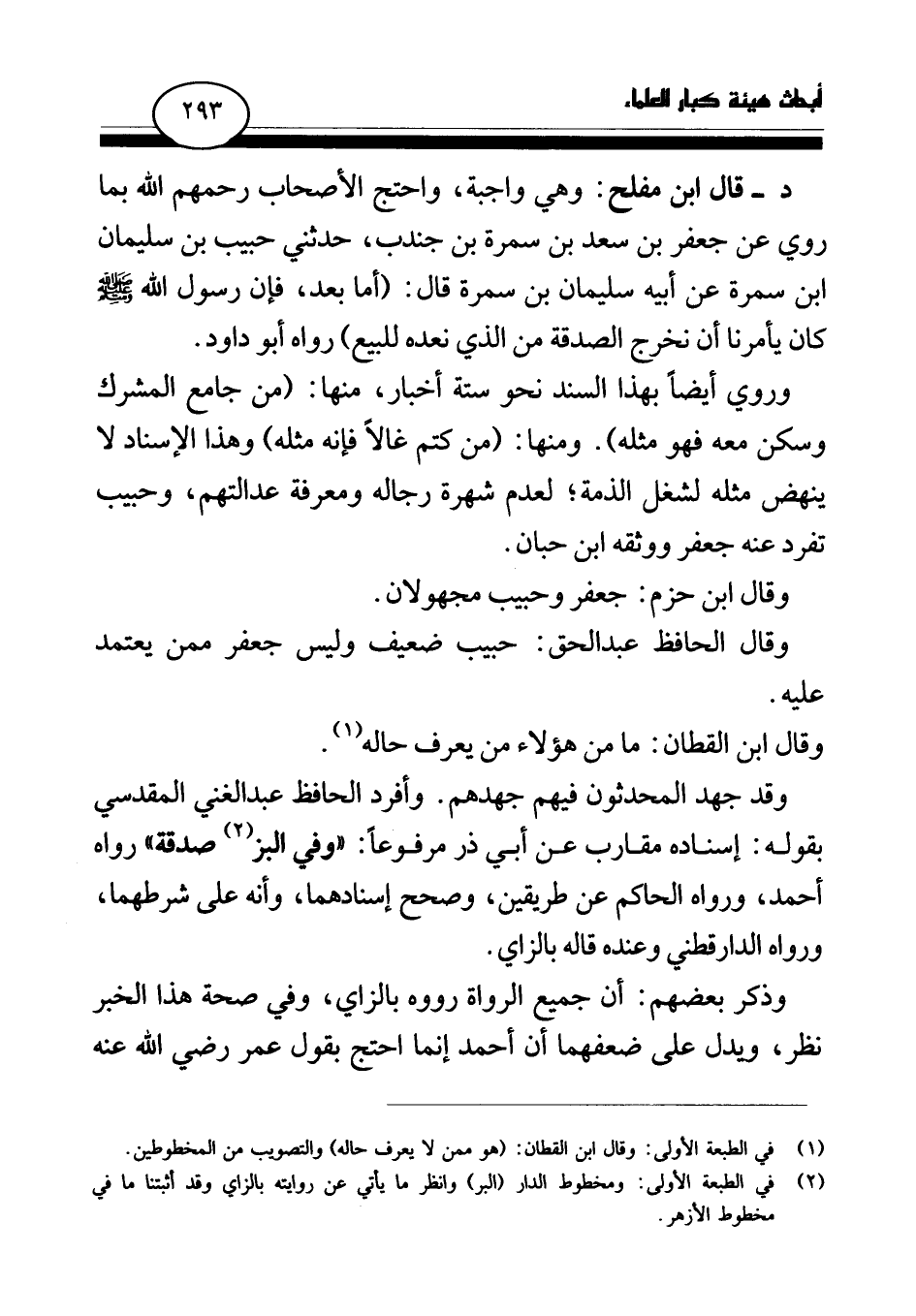 وروي أيضا بهذا السند نحو ستة أخبار، منها: (من جامع المشرك وسكن معه فهو مثله) . ومنها: (من كتم غالا فإنه مثله) وهذا الإسناد لا ينهض مثله لشغل الذمة؛ لعدم شهرة رجاله ومعرفة عدالتهم، وحبيب تفرد عنه جعفر ووثقه ابن حبان. وقال ابن حزم: جعفر وحبيب مجهولان. وقال الحافظ عبد الحق: حبيب ضعيف وليس جعفر ممن يعتمد عليه. وقال ابن القطان: ما من هؤلاء من يعرف حاله (¬2) وقد جهد المحدثون فيهم جهدهم. وأفرد الحافظ عبد الغني المقدسي بقوله: إسناده مقارب عن أبي ذر مرفوعا: «وفي البز صدقة» رواه أحمد، ورواه الحاكم عن طريقين، وصحح إسنادهما، وأنه على شرطهما، ورواه الدارقطني وعنده قاله بالزاي.