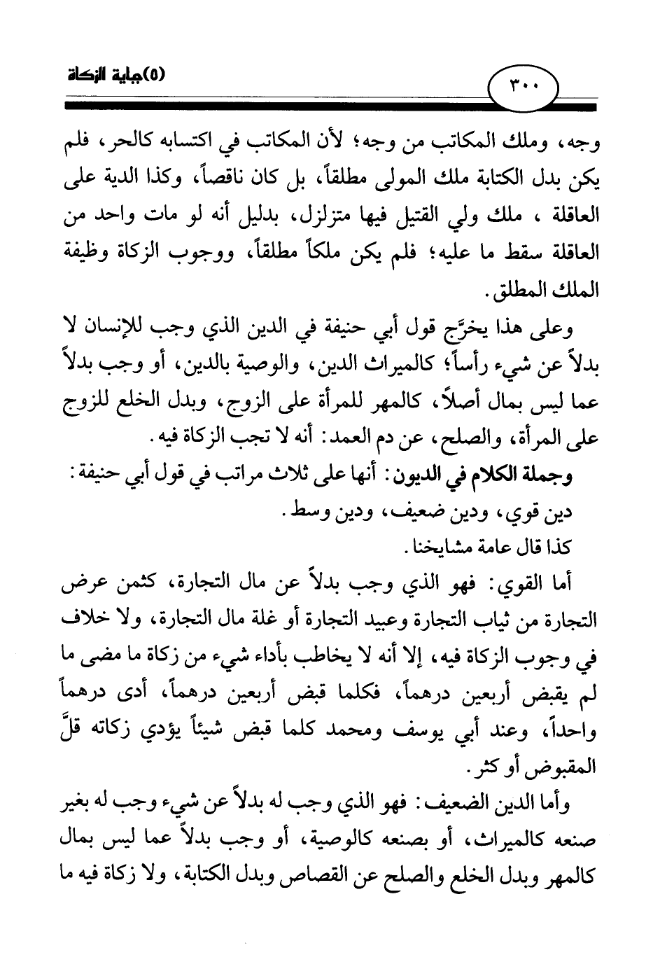 أما القوي: فهو الذي وجب بدلا عن مال التجارة، كثمن عرض التجارة من ثياب التجارة وعبيد التجارة أو غلة مال التجارة، ولا خلاف في وجوب الزكاة فيه، إلا أنه لا يخاطب بأداء شيء من زكاة ما مضى ما لم يقبض أربعين درهما، فكلما قبض أربعين درهما، أدى درهما واحدا، وعند أبي يوسف ومحمد كلما قبض شيئا يؤدي زكاته قل المقبوض أو كثر.